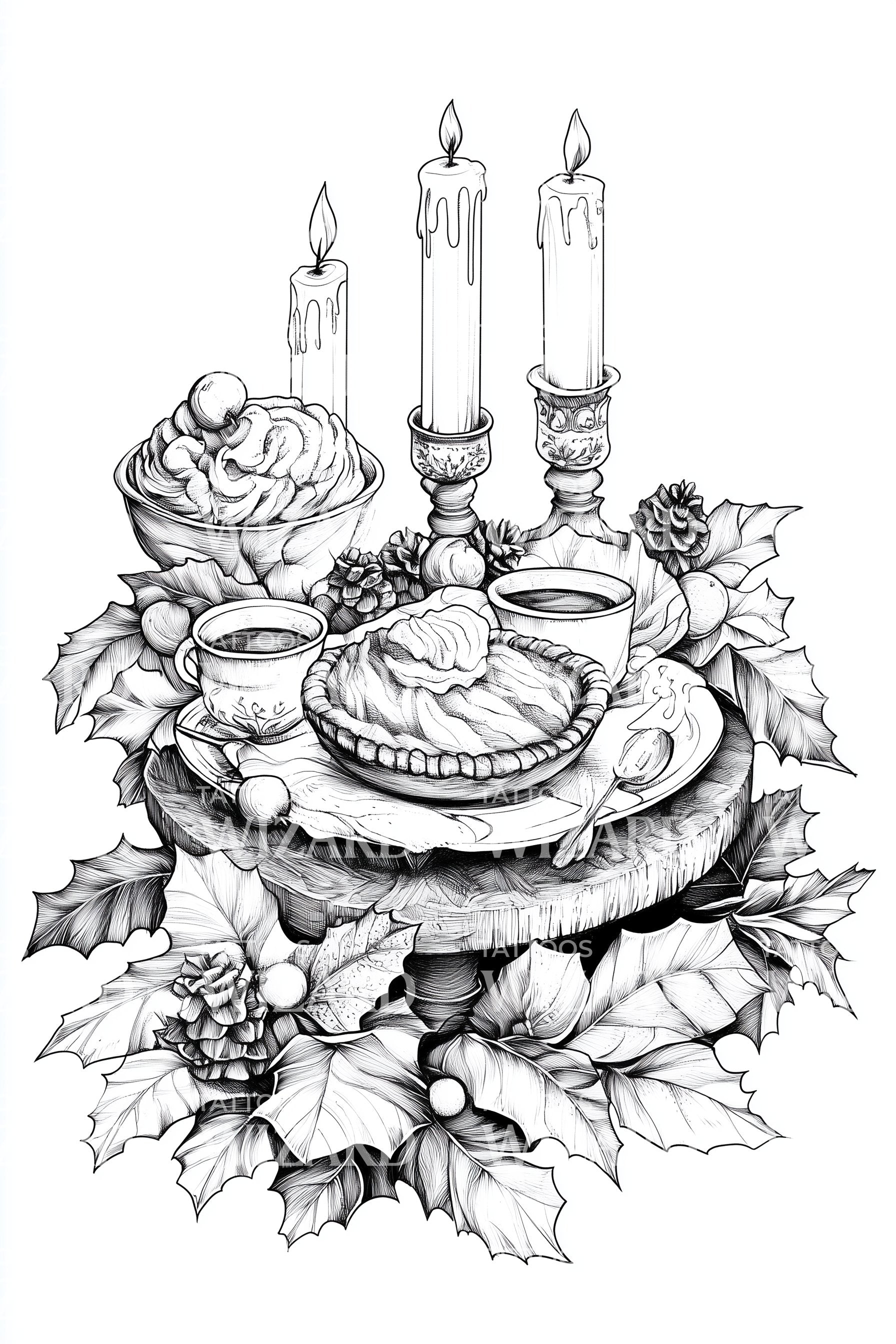 Candlelit still life in black&grey, with dripping tapers, vintage holders, and a rustic feast of pie, cream, and steaming cups, crowned by holly and leaves. Candles promise guidance; dessert honors celebration and gratitude; evergreen speaks endurance. Worn close, it feels hearth-warm, nostalgic, and quietly abundant, through winter nights.