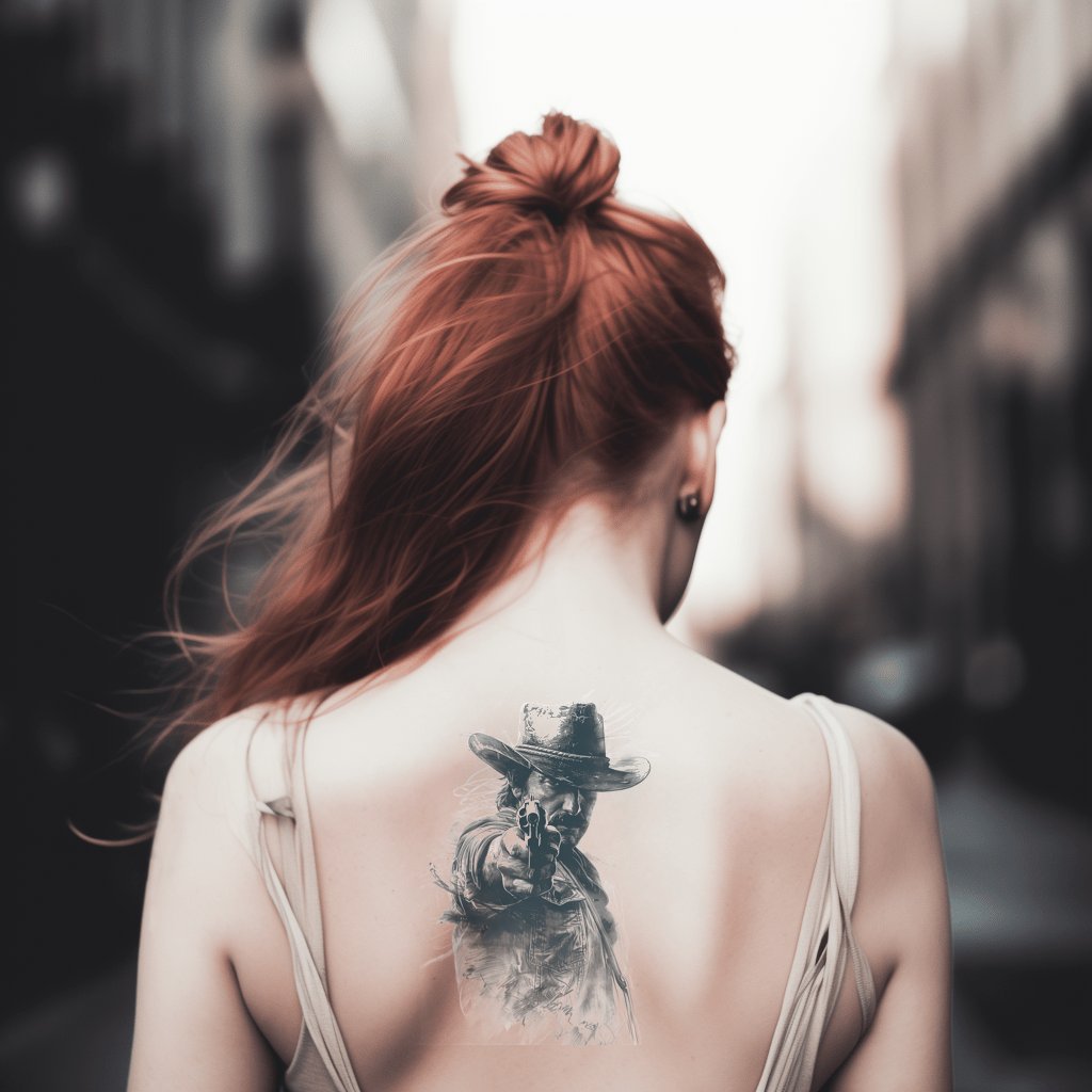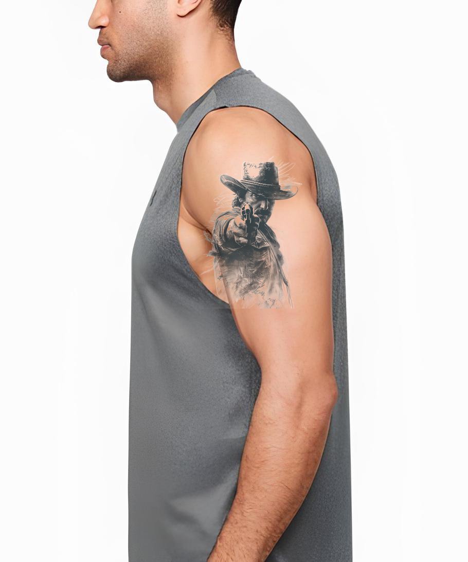 Präsentieren Sie Ihren ungezähmten Geist mit diesem realistischen Cowboy-Tattoo-Design. Es verkörpert brillant männliche Stärke und Stil und zeigt eine detaillierte Darstellung eines Cowboyhuts und einer bedrohlichen Pistole, die feuert. Perfekt für diejenigen, die eine intensive Liebe zum Wilden Westen in ihren Herzen tragen.