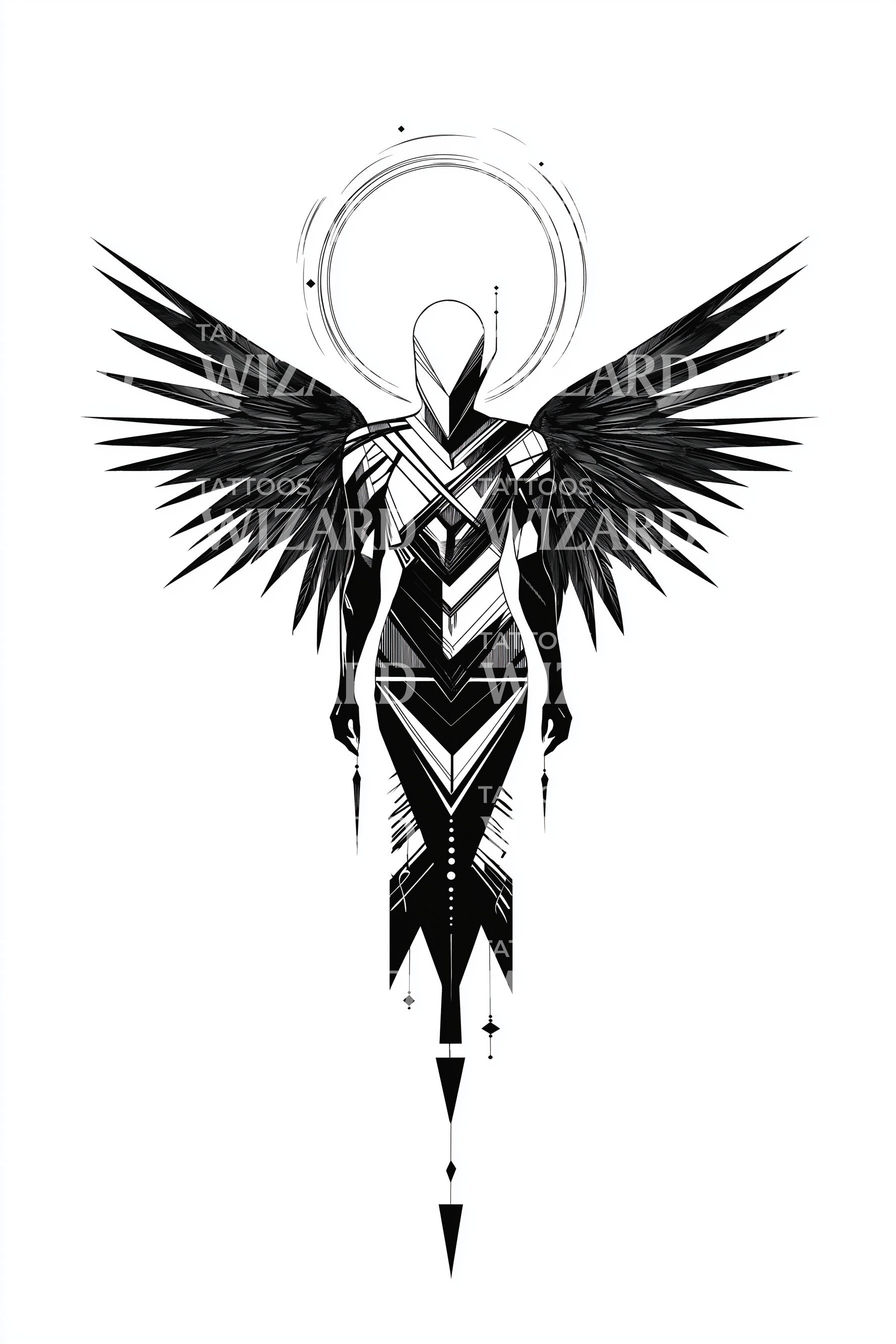 Architectural blackwork forms a faceless angel, armored in geometric chevrons, flanked by razor-feathered wings and crowned with a luminous halo. Celestial lines descend like stardust spears. Symbol of protection and clarity, this guardian speaks of resilience and guidance, gifting its wearer calm courage, vigilant purpose, and inner flight.