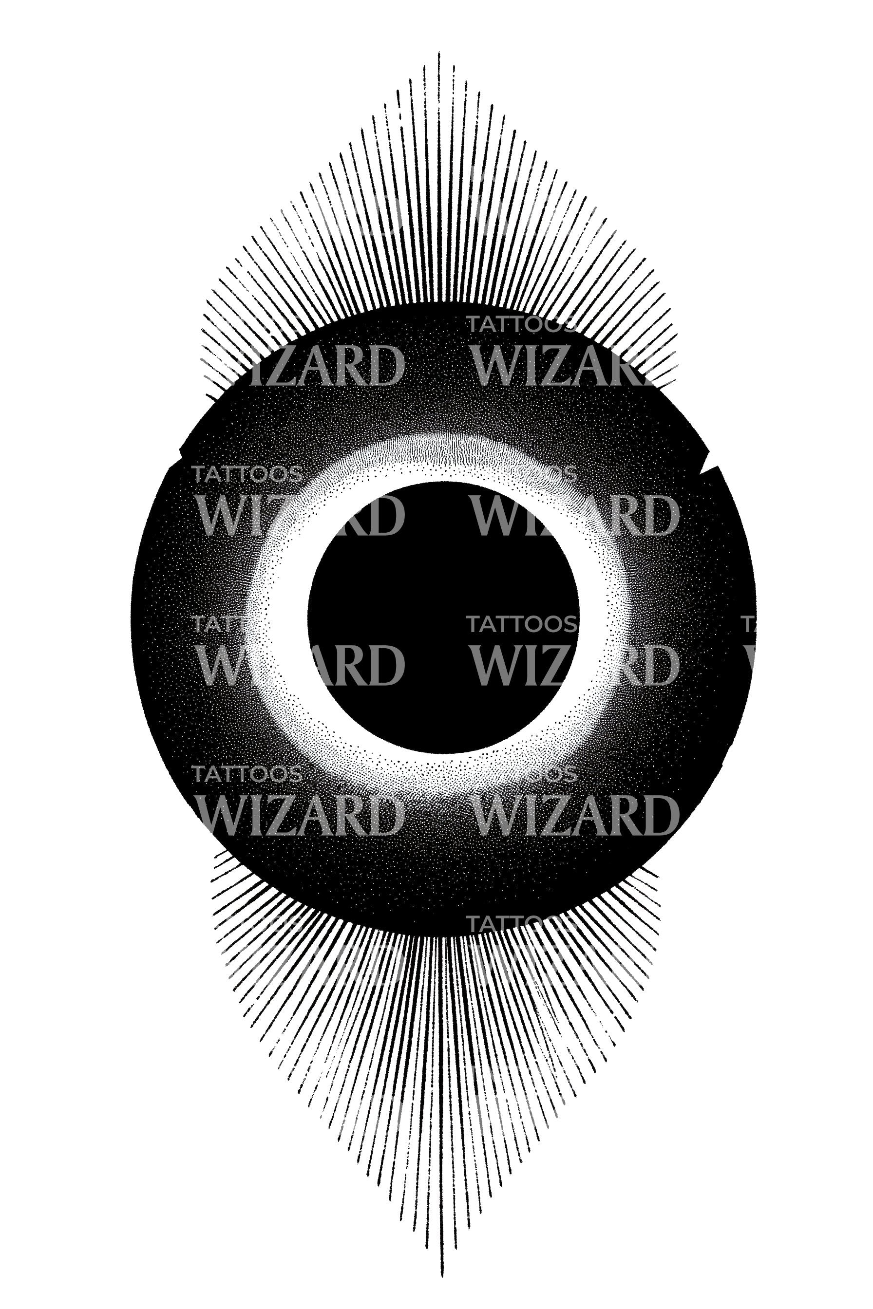 Eclipse portal in meticulous dotwork: void-black core ringed by glowing corona, swallowed by grainy halo; fine rays fan above and below in opart precision. Alignment speaks of cycles and thresholds between shadow and light, opening dimension and space. Wearing it feels like calm gravity, lucid focus, quiet cosmic bravery.