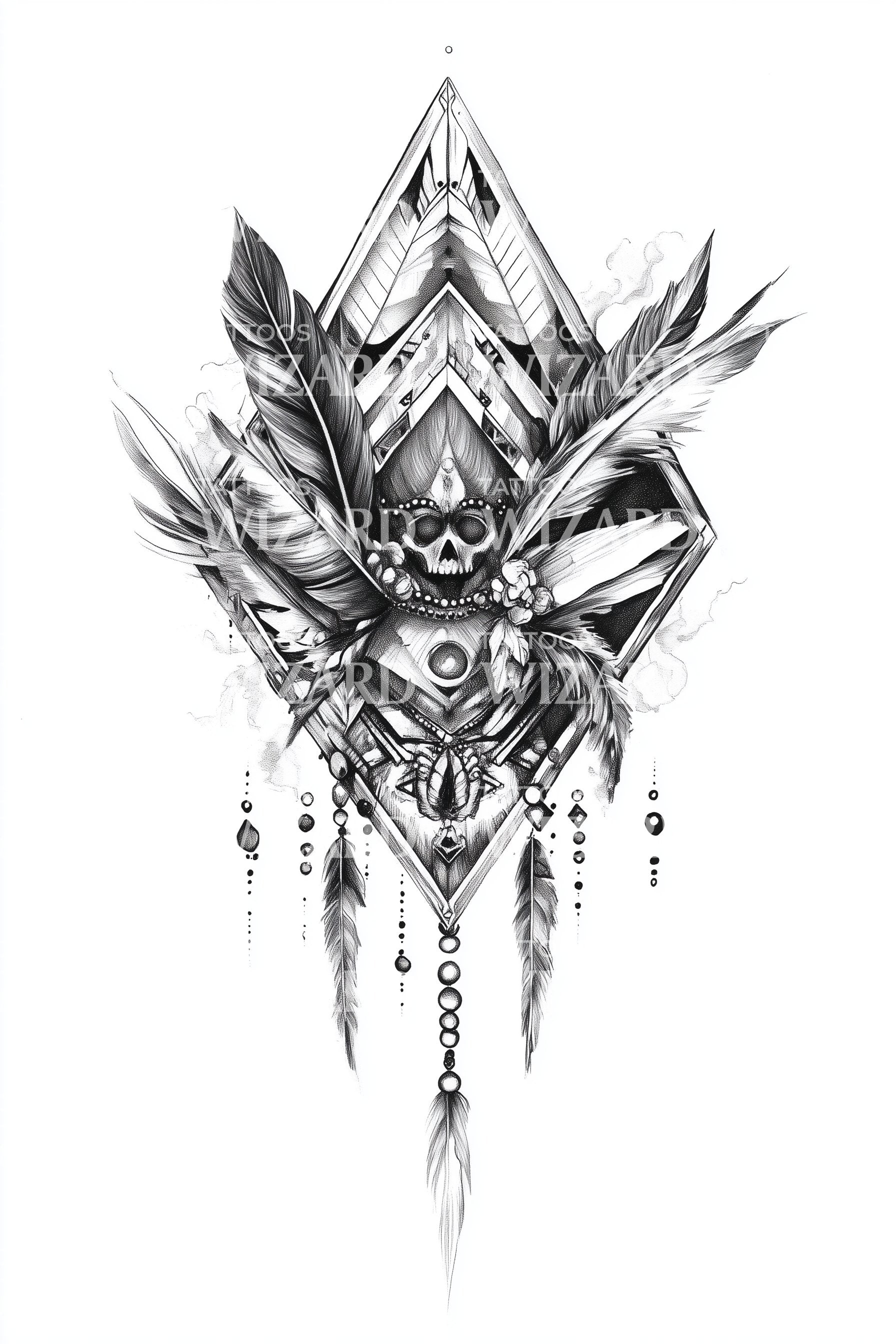 Blackwork totem forged in crisp geometry, a tribal diamond cradling a spiritual mask, skull, and feathered constellations. Shapes stack like shields, beads fall like prayers, a scarab anchors renewal. Symbol of fox cunning, protection, and transformation, this mark steadies the heart and awakens quiet, hunter-bright resolve and clarity.