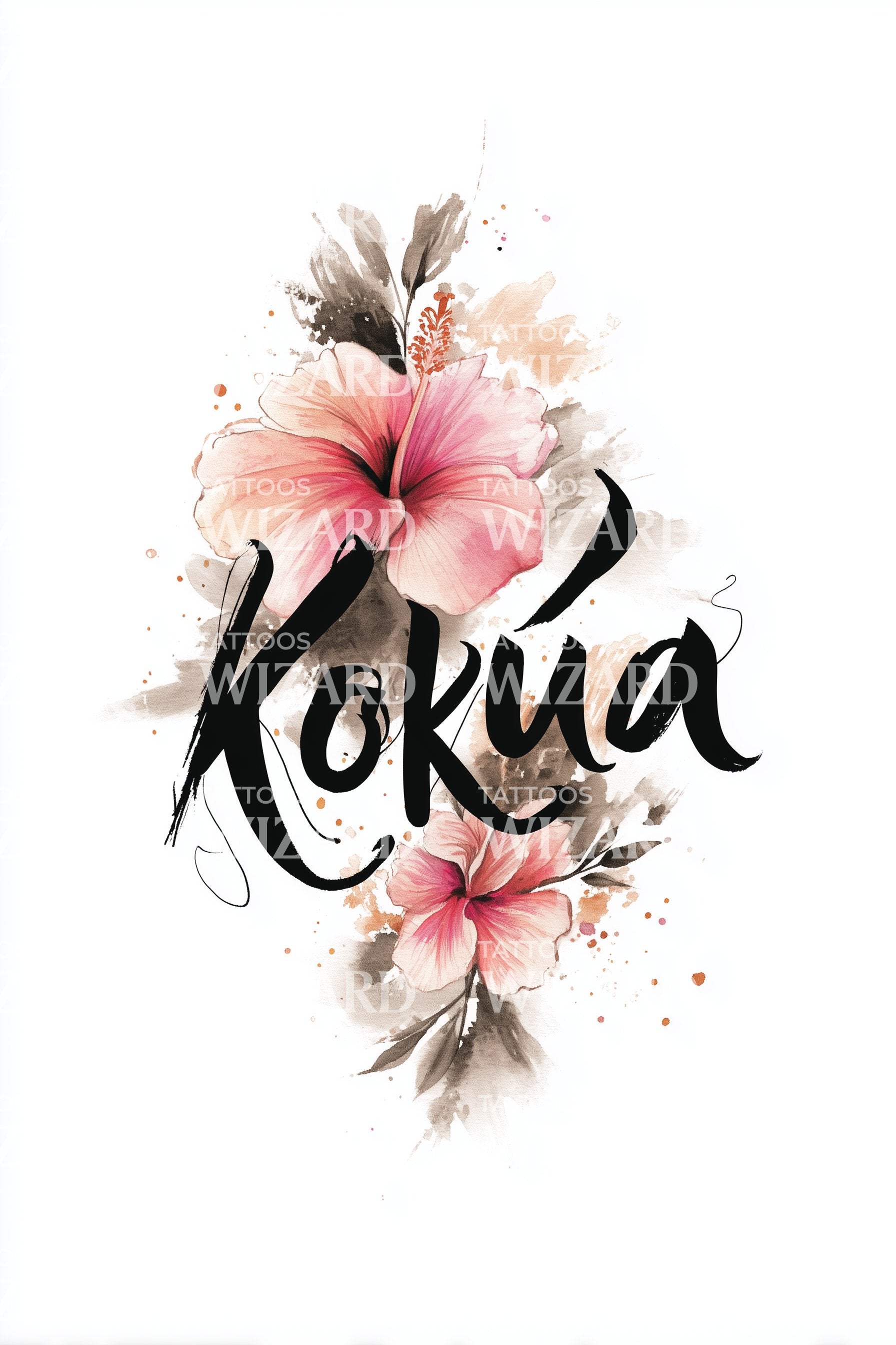 Watercolor hibiscus blooms unfurl in coral and blush, splashed with sunlit ochres around bold brush script reading Kokua. Each petal celebrates island breezes and the gentle power of kindness. Symbolizing shared help and open-hearted support, this design feels like warm trade winds, inviting compassionate action wherever you wander.