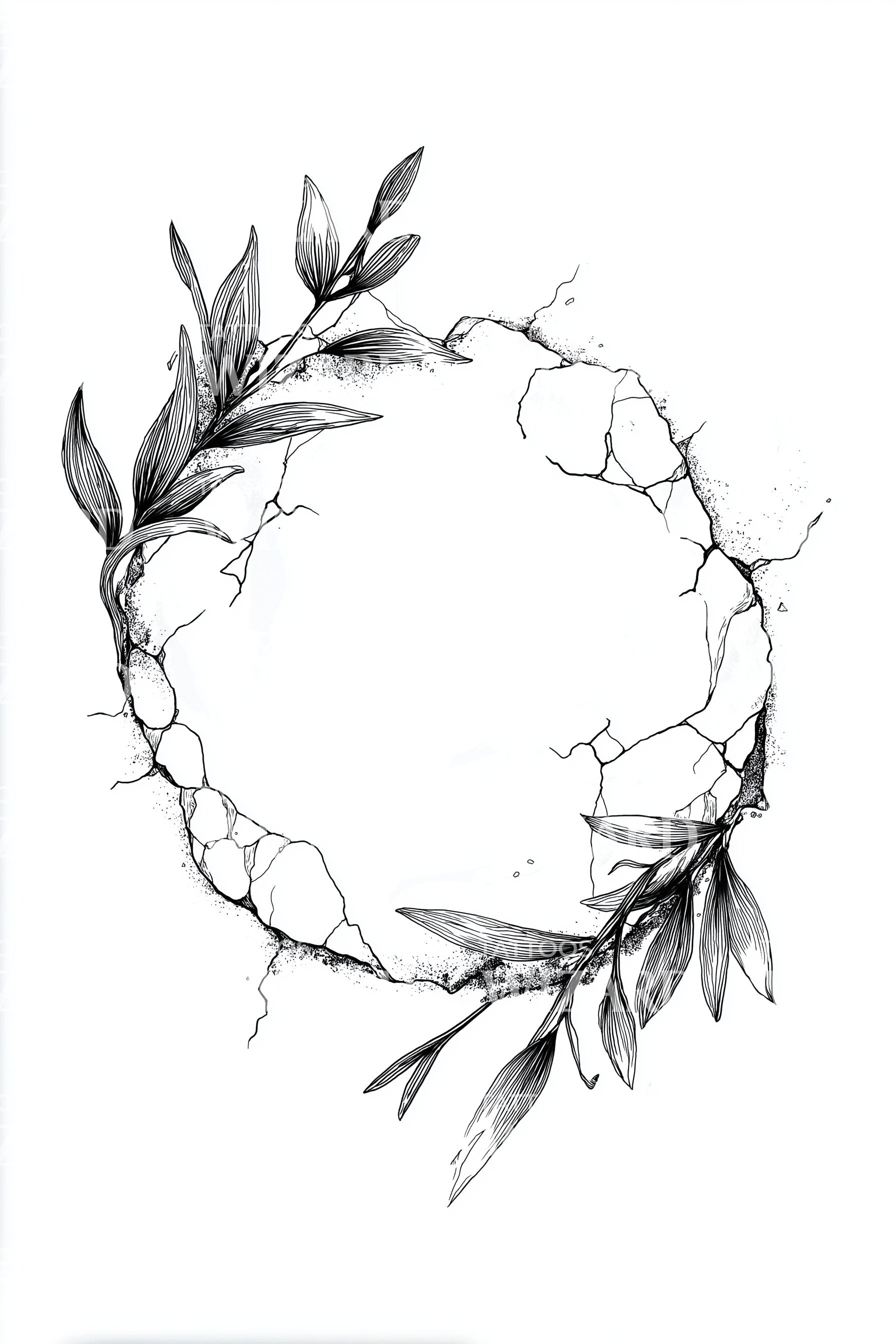 Floral laurel wreath of fine-line leaves encircles a ring of delicate cracks, where stone seems to yield to life. The fractured halo speaks of resilience, honor, and rebirth, an organic crown rising from upheaval. Wearing it feels grounded yet luminous, a quiet triumph carried close.
