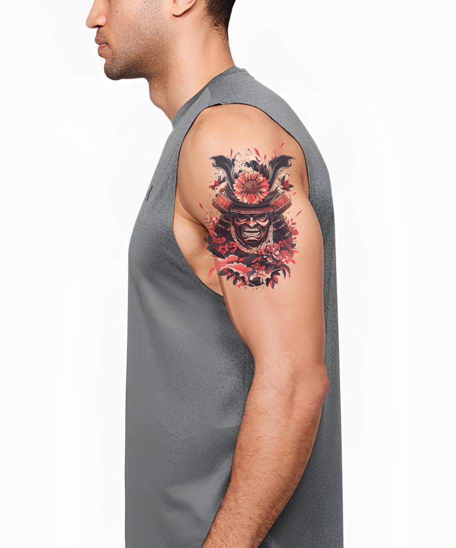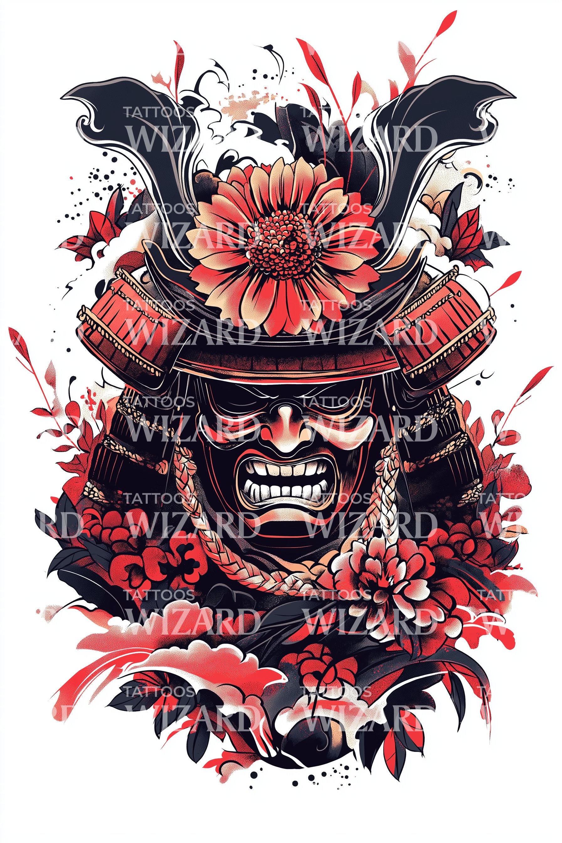 Umarme den Geist eines furchtlosen Kriegers mit diesem japanisch inspirierten Tattoo-Design. Es zeigt einen imposanten Samurai, der eine Oni-Maske trägt, umgeben von blühenden Blüten, und fängt die dynamische Spannung des Kampfes sowie die ruhige Schönheit Japans ein. Perfekt für jeden, der den wahren Geist eines traditionellen japanischen Kriegers verkörpert.