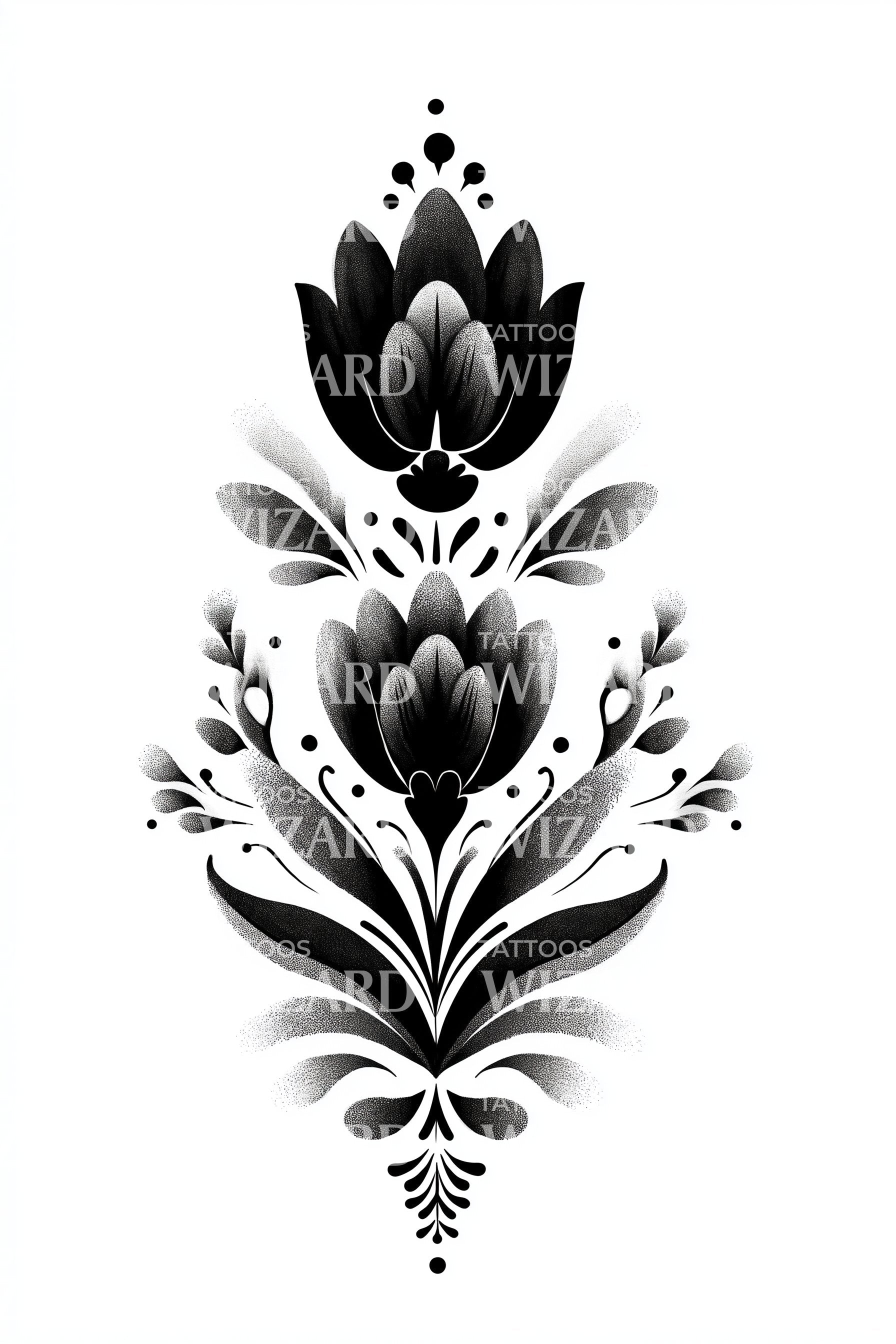 Rooted in Nordic folklore, this blackwork bouquet blooms with twin tulips, dot-shaded petals, and ornate leaves in calm symmetry. The flowers symbolize renewal and steadfast growth, while scattered droplets mark life's quiet milestones. Worn on skin, the pattern feels protective, grounded, and quietly radiant, like carrying winter sunlight.