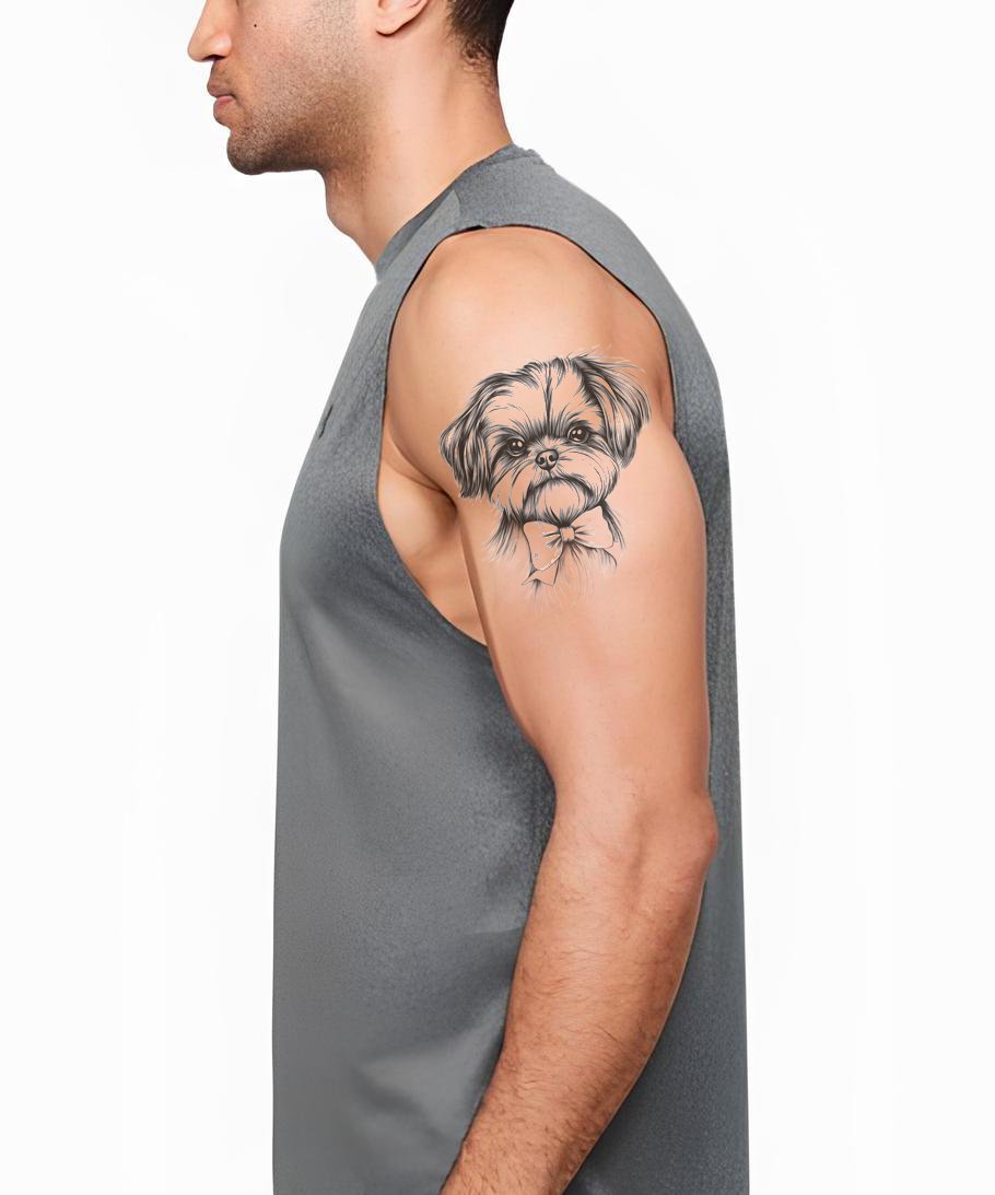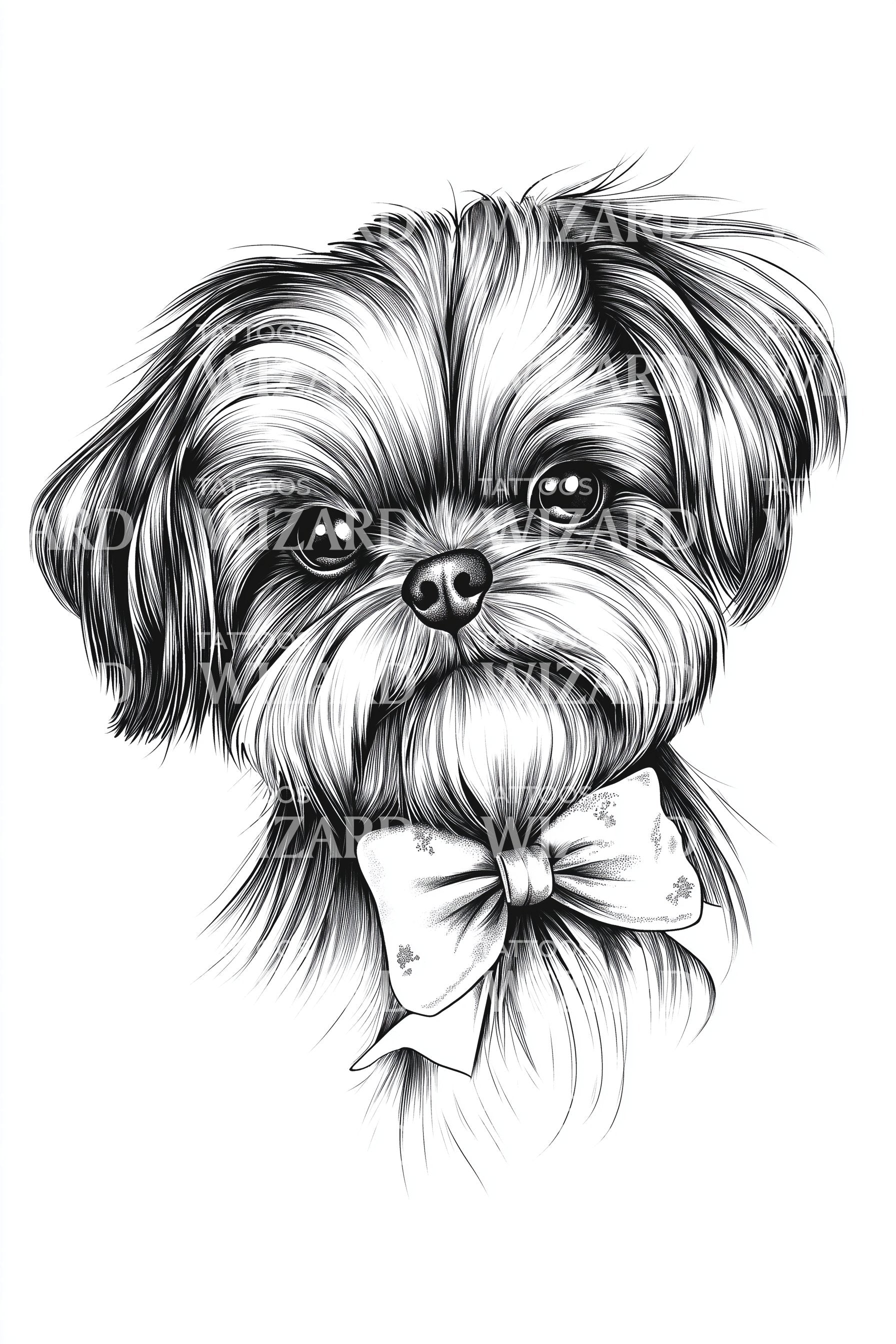 Black and grey realism renders a Shih Tzu dog portrait, silky fur etched in delicate strokes, eyes shining like midnight pearls, a playful bowtie softly tied. Symbolizing steadfast loyalty and small-but-mighty guardianship, this cute muse carries memory and devotion, gifting its wearer comfort, cheer, and elegant belonging daily.