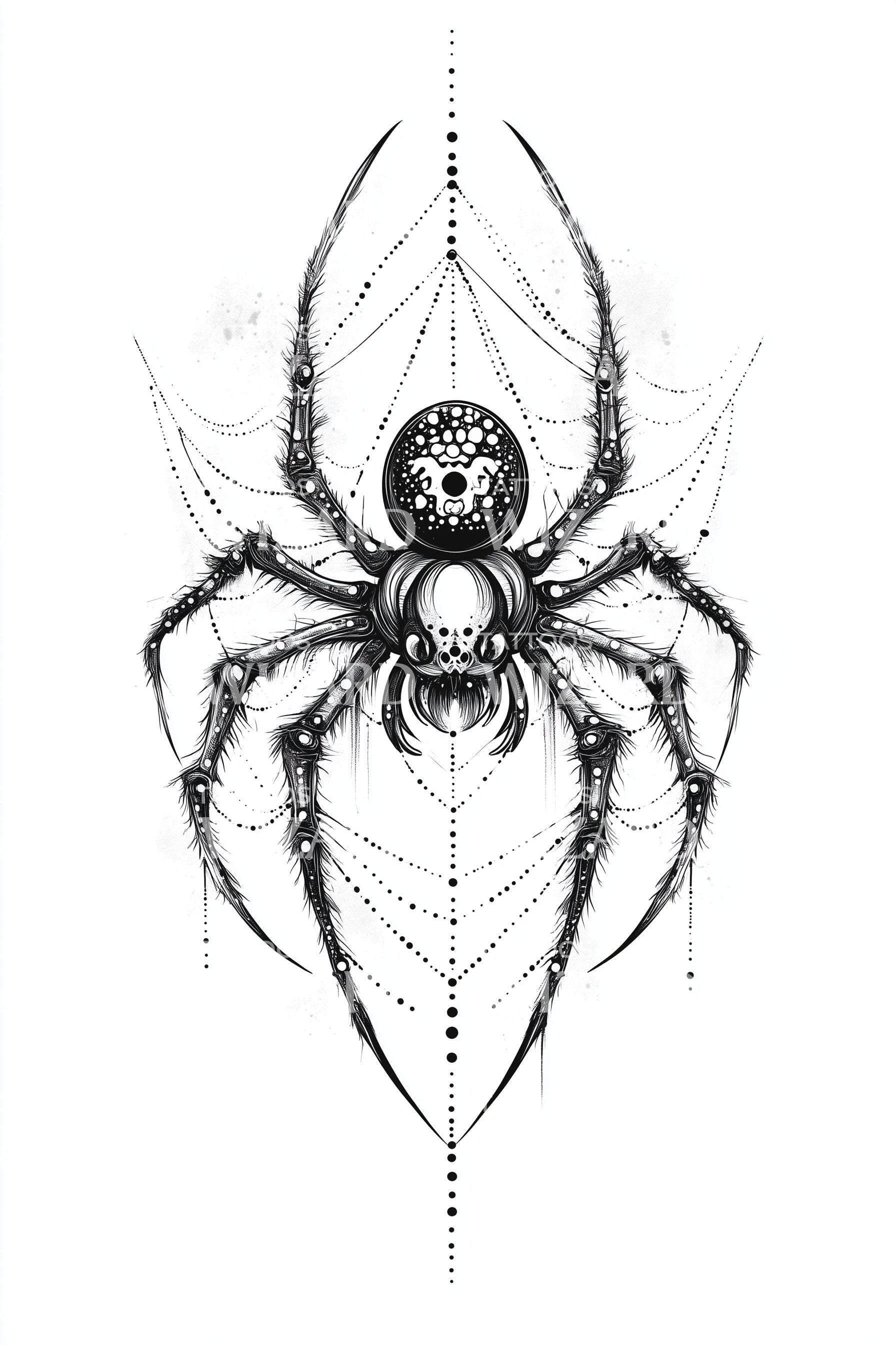 Dotwork-Spinne strahlt von einer vertikalen Perlenlinie aus, Beine über einem Netz gewölbt; ein kreisförmiges Siegel krönt den Hinterleib. Symbol der okkulten Weberin, es ruft Schutz, Geduld und das Schicksalsdesign hervor. Fühlt sich an wie wachsame Ruhe. Ideale Platzierungen: Wirbelsäule für Ausrichtung, Brustbein als Schild, Unterarm für Reichweite, Wade für eine verlängerte Silhouette.