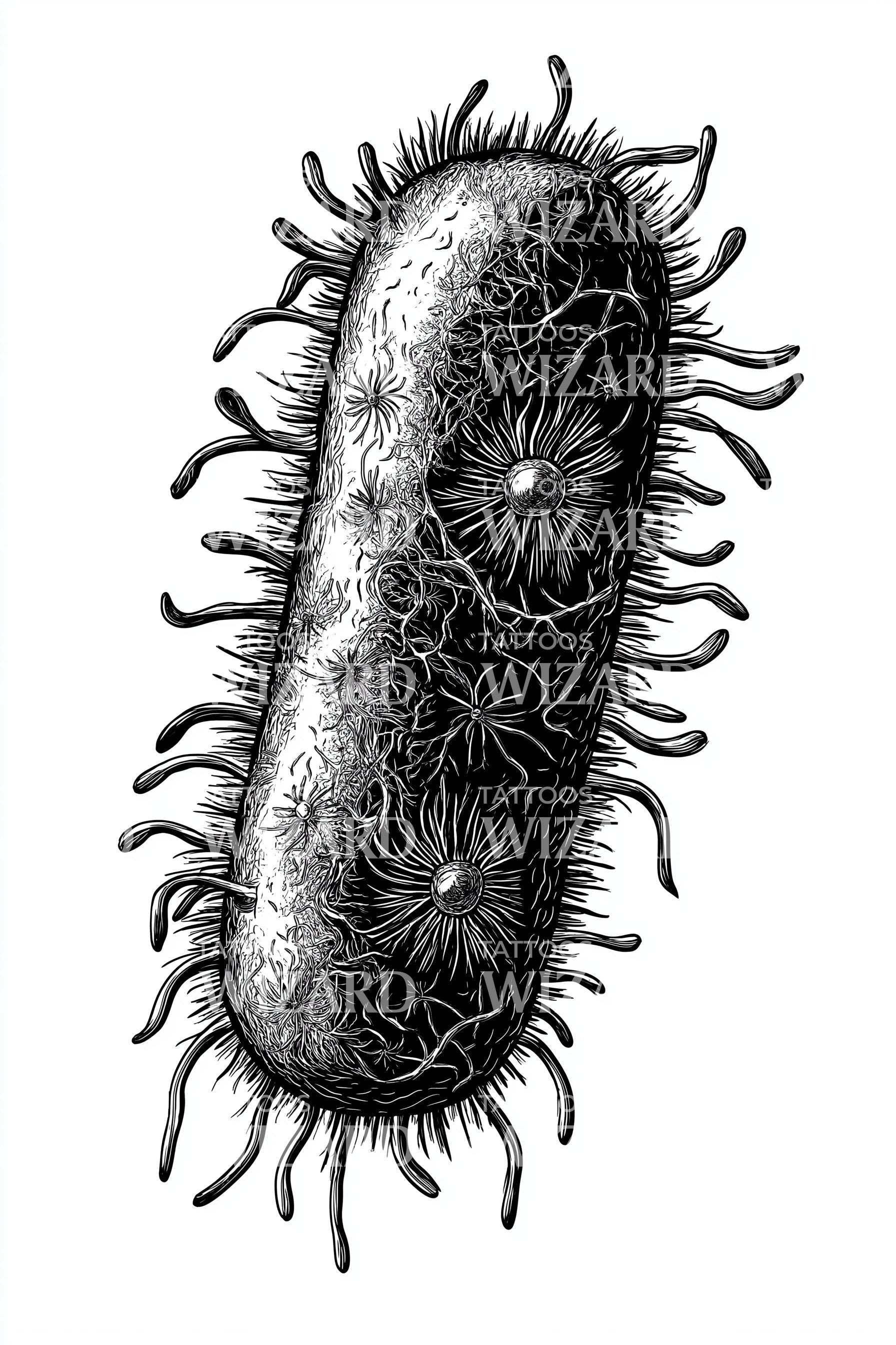 Beneath the clean stories, a bacterium tells the truth: life survives by transforming what tries to break it. Drawn to the dark, you claim your instincts as sacred science. Blackwork texture and spikes become a vow. A microbe hymns: “I evolve in shadow.”