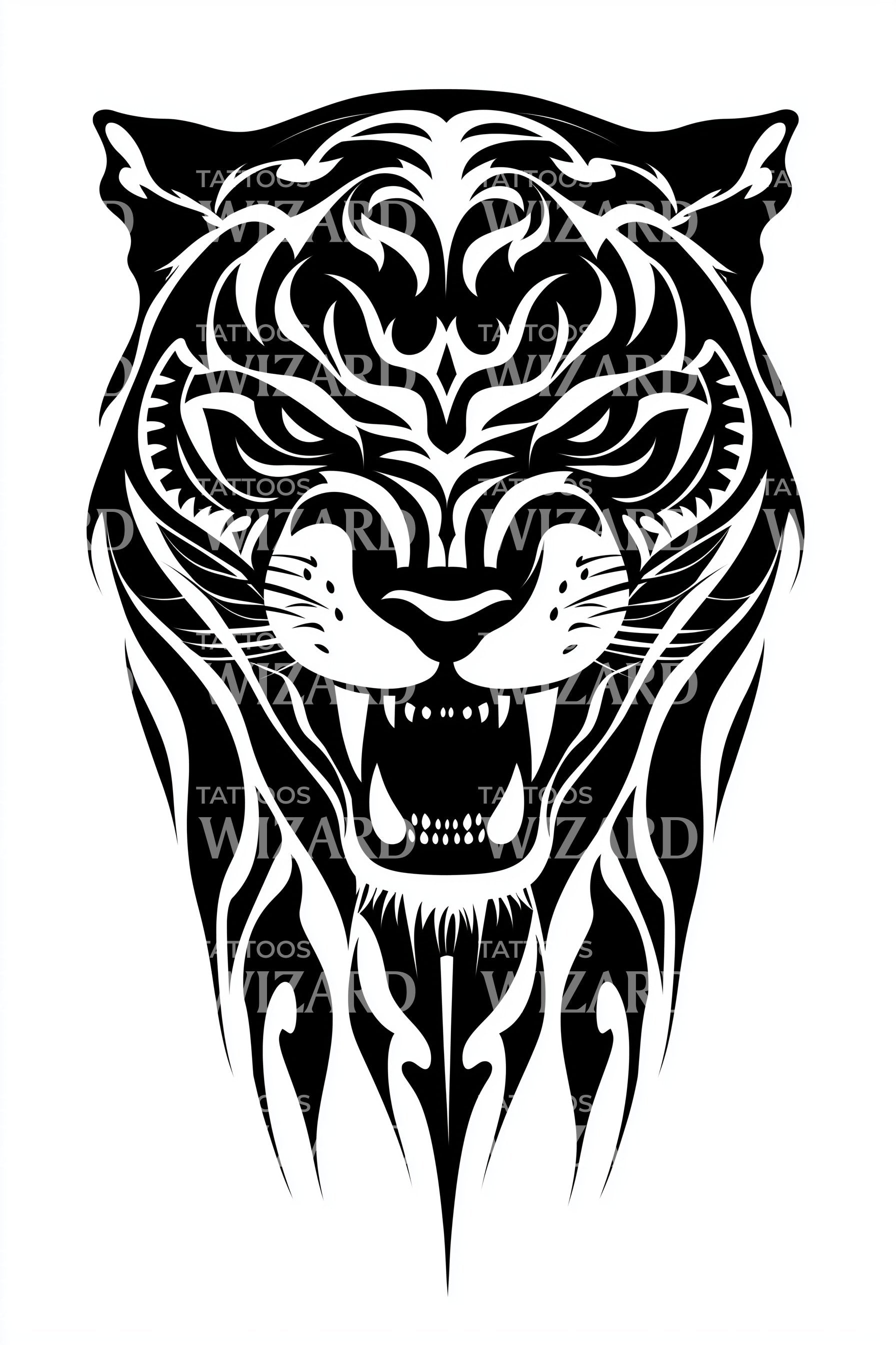 Strahle Kraft, Stärke und Wildheit mit diesem tribal Tiger-Tattoo-Design aus. Seine filigranen Details fangen das kraftvolle Brüllen des wilden Tieres ein und symbolisieren die unbändige Stärke des Tieres. Dieses Tribal-Kunstwerk ist nicht nur ein einfaches Tattoo; es ist eine Darstellung unsterblicher Macht und ursprünglicher Kraft.