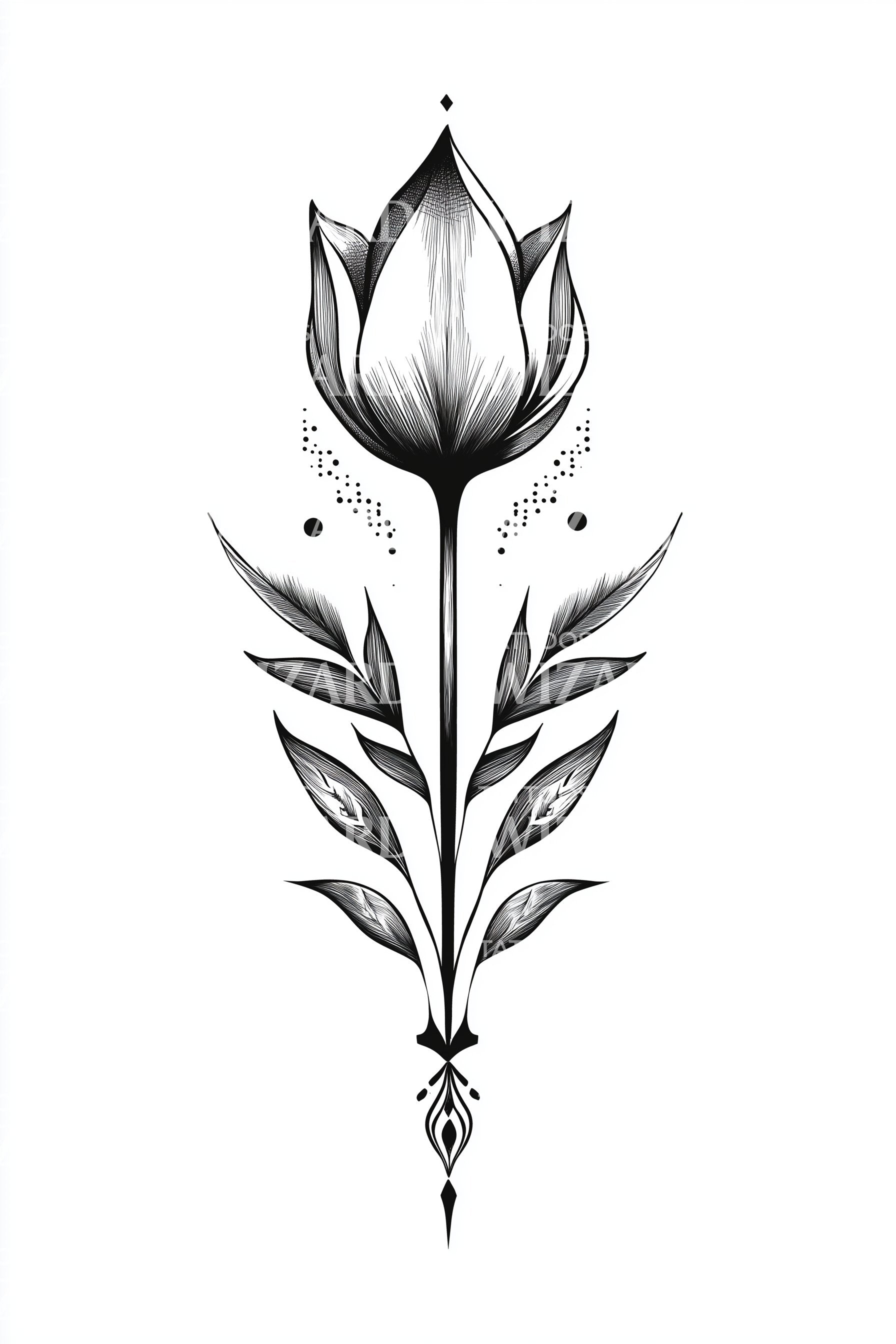 Fineline tulip rising in elegant black linework, petals softly shaded, leaves symmetrical and airy, dotted accents floating like quiet breath. A minimal floral ode to renewal and devotion, symbolizing gentle strength and beginnings. Worn on skin, it feels serene, poised, and radiant; a reminder to bloom with grace.