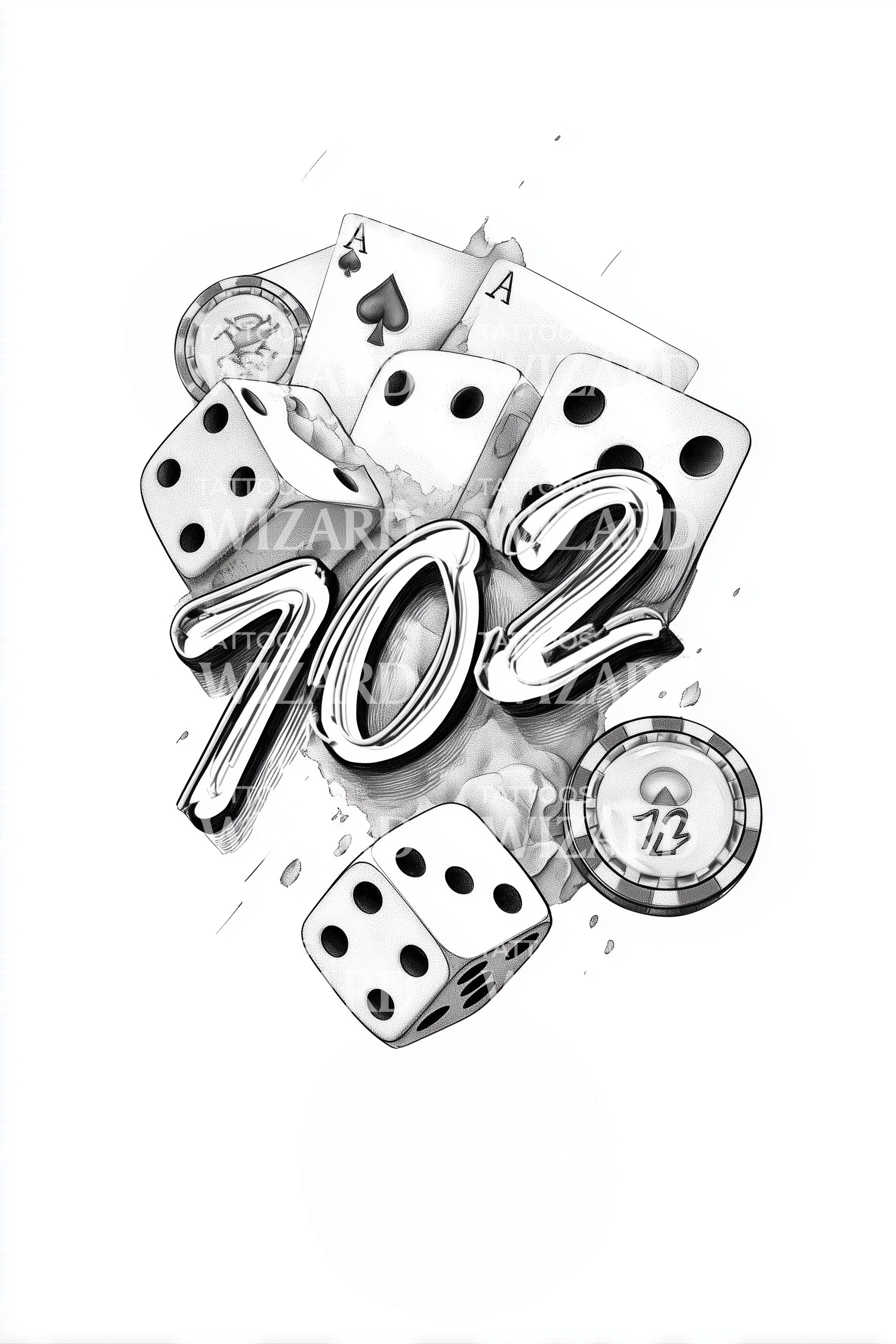 Neon-bold newschool energy floods this piece: chrome 702 rises through ripped paper, flanked by stacked dice, twin aces, and casino chips. Symbols of Vegas grit and Nevada pride, it honors risk, timing, and luck. Worn daily, it feels like hot streak momentum and hometown heartbeat, with glow and swagger.