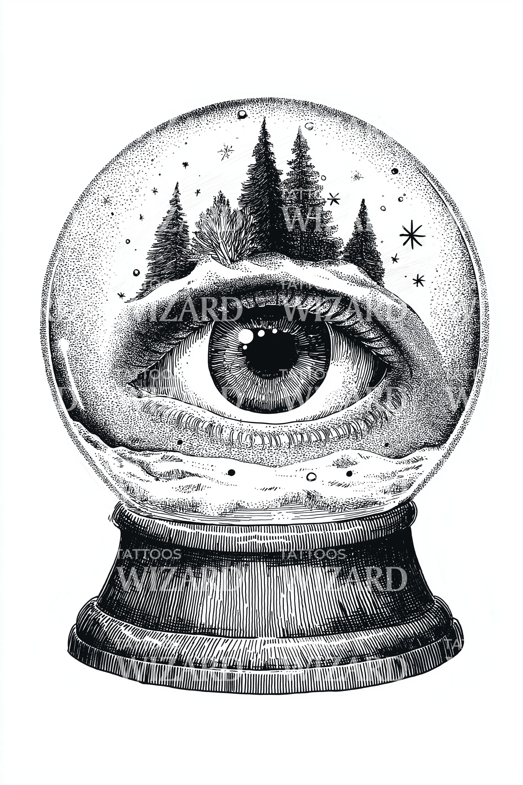 Black&grey shading forms a classic snowglobe where a vigilant eye watches a starlit winter forest. Pointillism textures frost and glass, timeless and serene. Symbolizing insight through stillness, it honors clarity in cold seasons. Worn, it feels grounding, protective, and quietly mystical, guiding reflection and resilience through inner journeys.