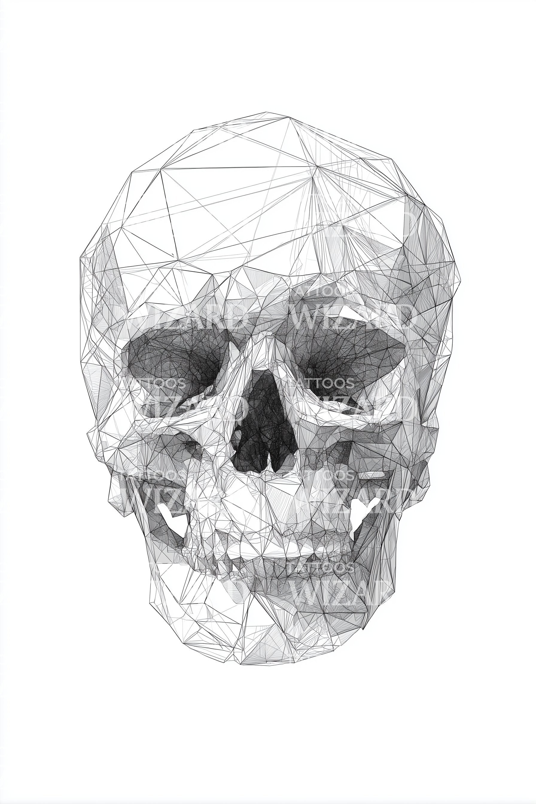 Erleben Sie die Verschmelzung von Kreativität und Präzision mit diesem geometrischen Drahtgitter-Schädel-Tattoo-Design. Kunstvoll gefertigt mit technischen Linienstudien, übersteigt dieses abstrakte Werk die traditionelle Kunst und verleiht Ihrer Haut die Essenz von Komplexität und Einzigartigkeit. Erleben Sie die Faszination neu definierter Körperkunst.