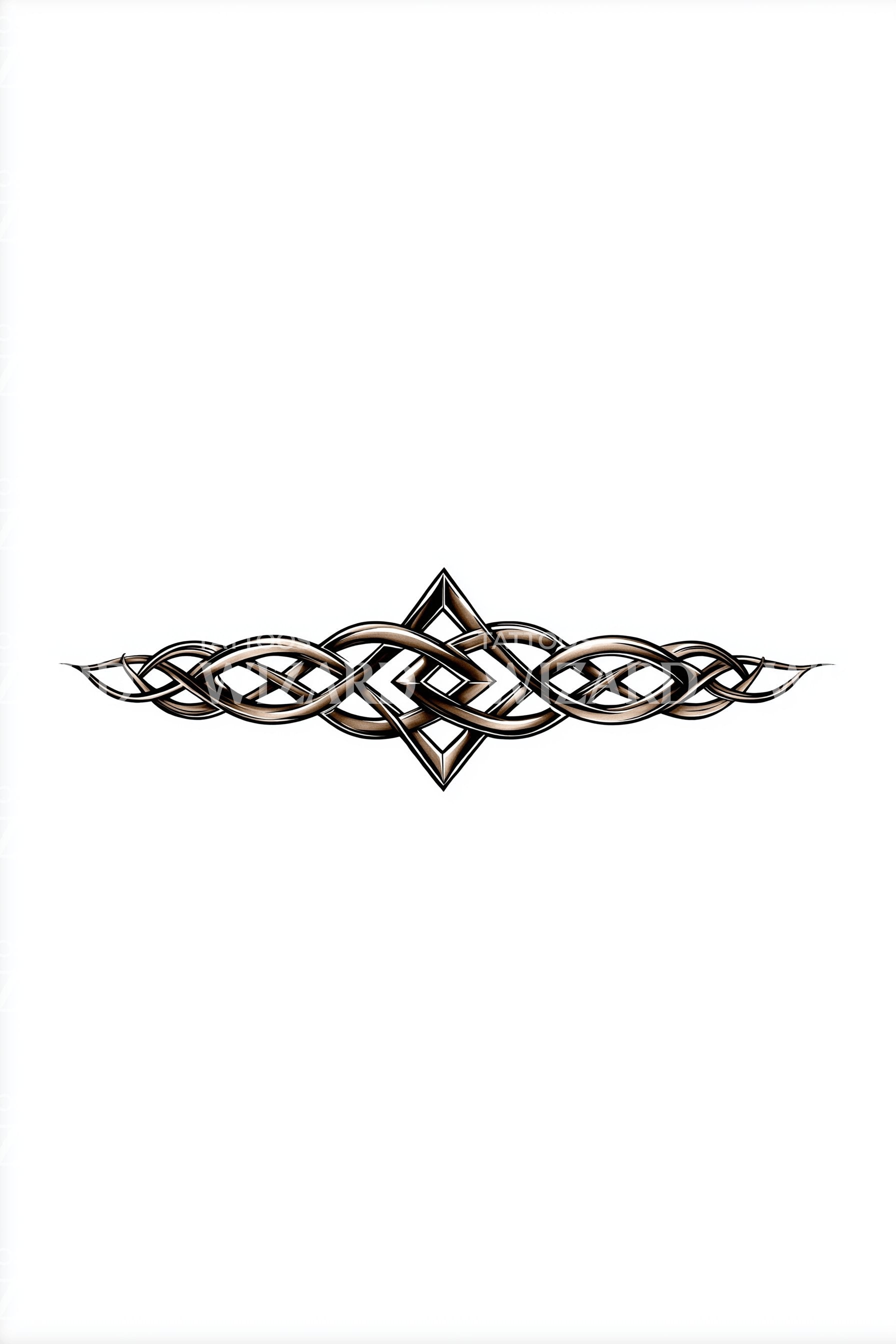 Braided blackwork border unfurls in a symmetrical Celtic knot, tapering vines guarding a diamond heart. Interlaced lines trace an unbroken path, honoring lineage, protection, and the weaving of destinies. Wearing it feels steady and storied, a quiet divider marking chapters while carrying ancestral strength close to skin.