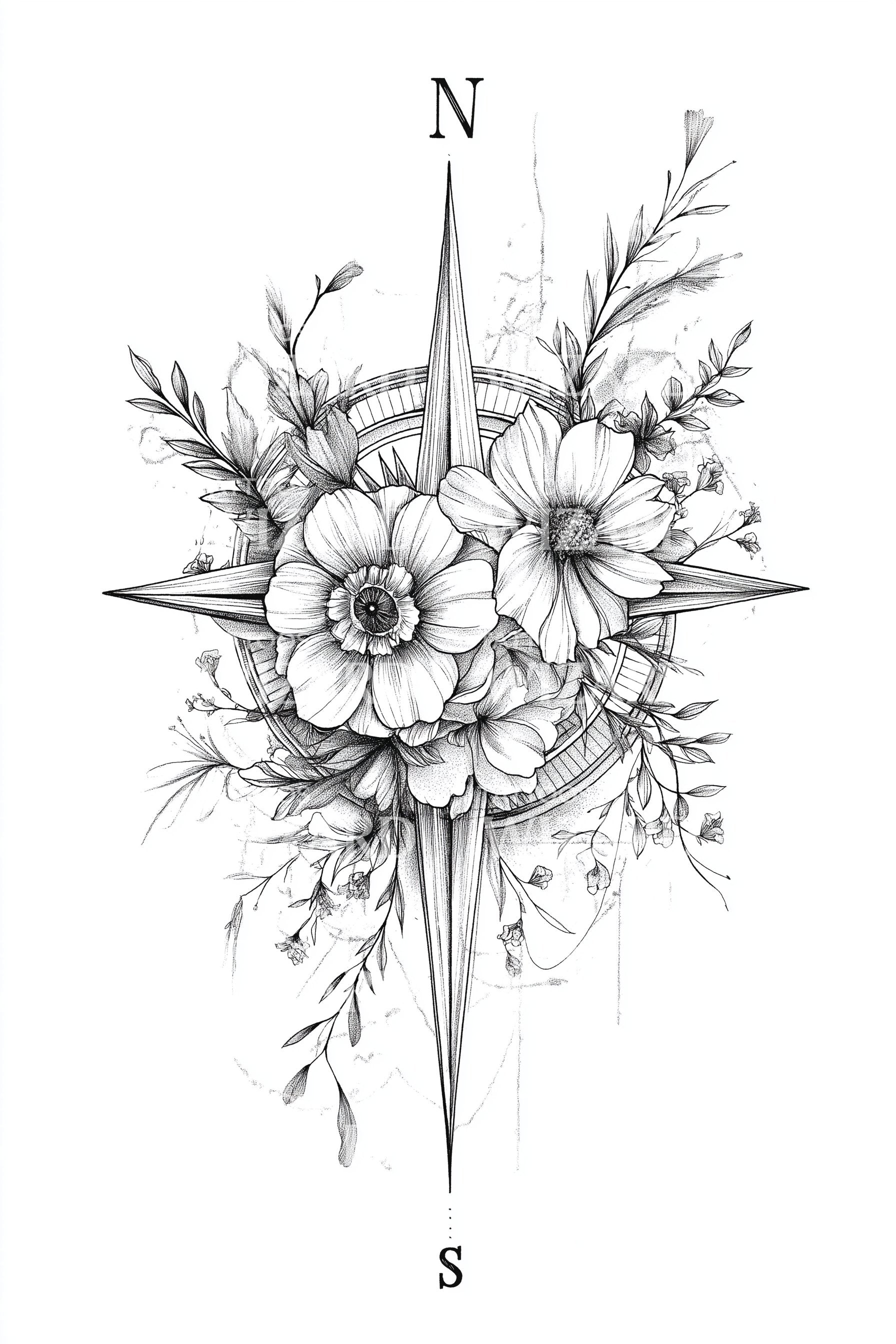 A compass rose held in geometry and softened by botanical courage, for the one who refuses to lose their north even while blooming. Navigation becomes devotion, not escape. Flowers insist that growth is a direction. “Find me where the lines meet the petals.”