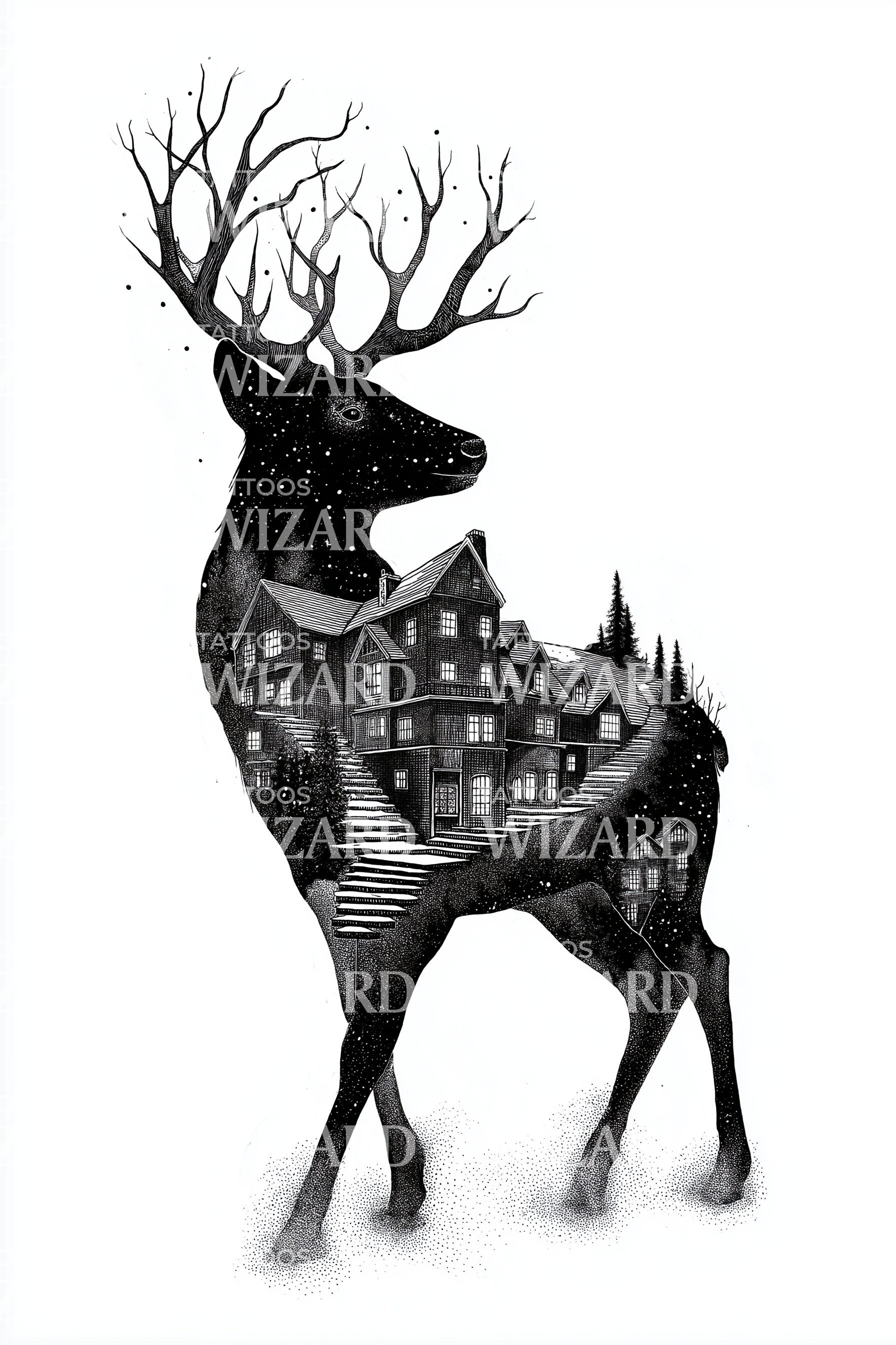Blackwork stag in stark silhouette, antlers branching like winter trees, holds a stepped cityscape and a forest of quiet pines in double exposure. Symbol of guardianship and threshold, it bridges wild instinct with built sanctuary, guiding wanderers home. Worn on skin, it feels grounded, purposeful, resilient, epic, enduring.