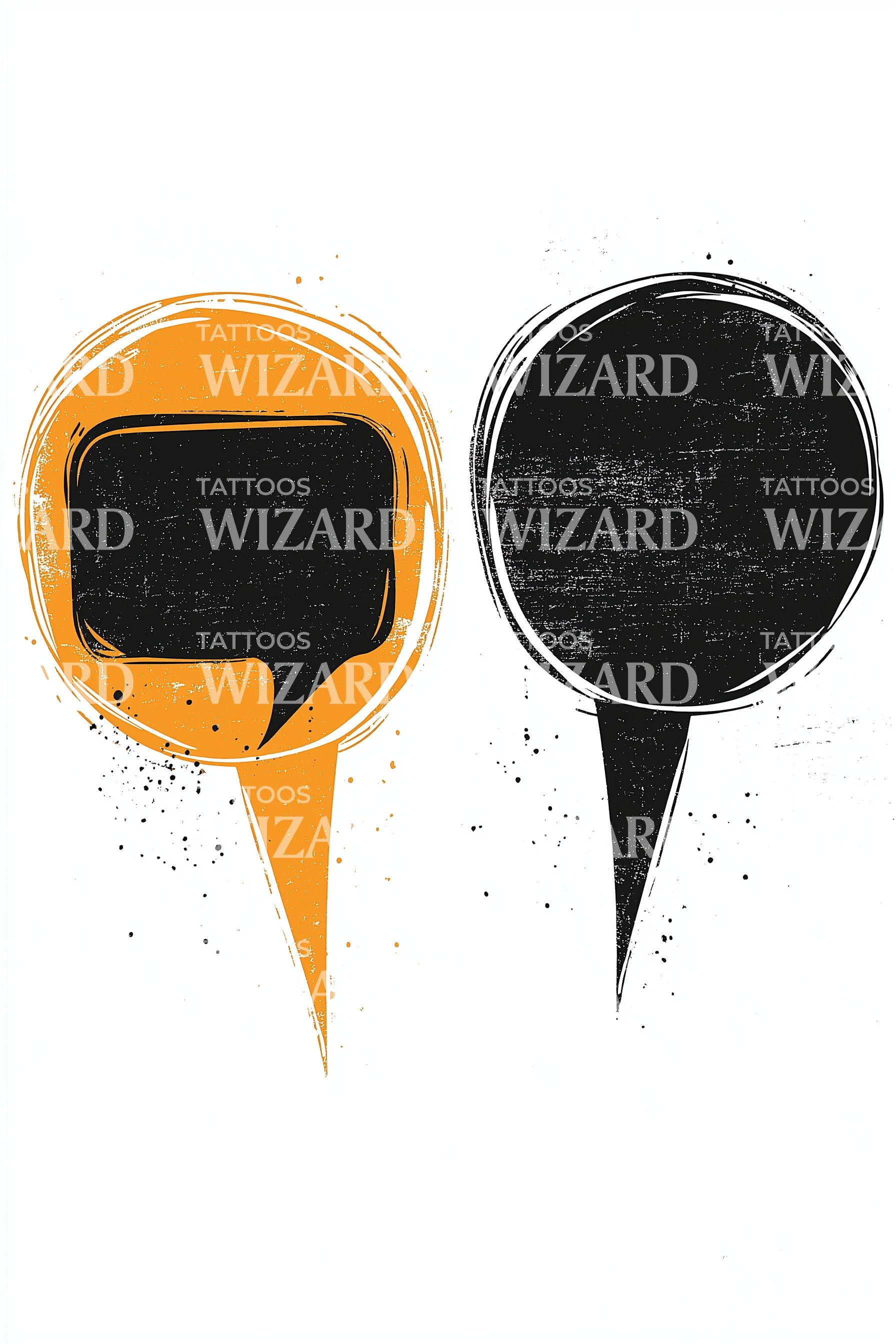 Grunge-splashed speech balloons pop in bold orange and blackout black, thick lines and ink spatters giving a raw newschool snap. Twin chat icons symbolize dialogue and listening, voice and pause, connection amid static. Wearing it feels brave, conversational, and unapologetically graphic, your story shouted and heard, everywhere, always.