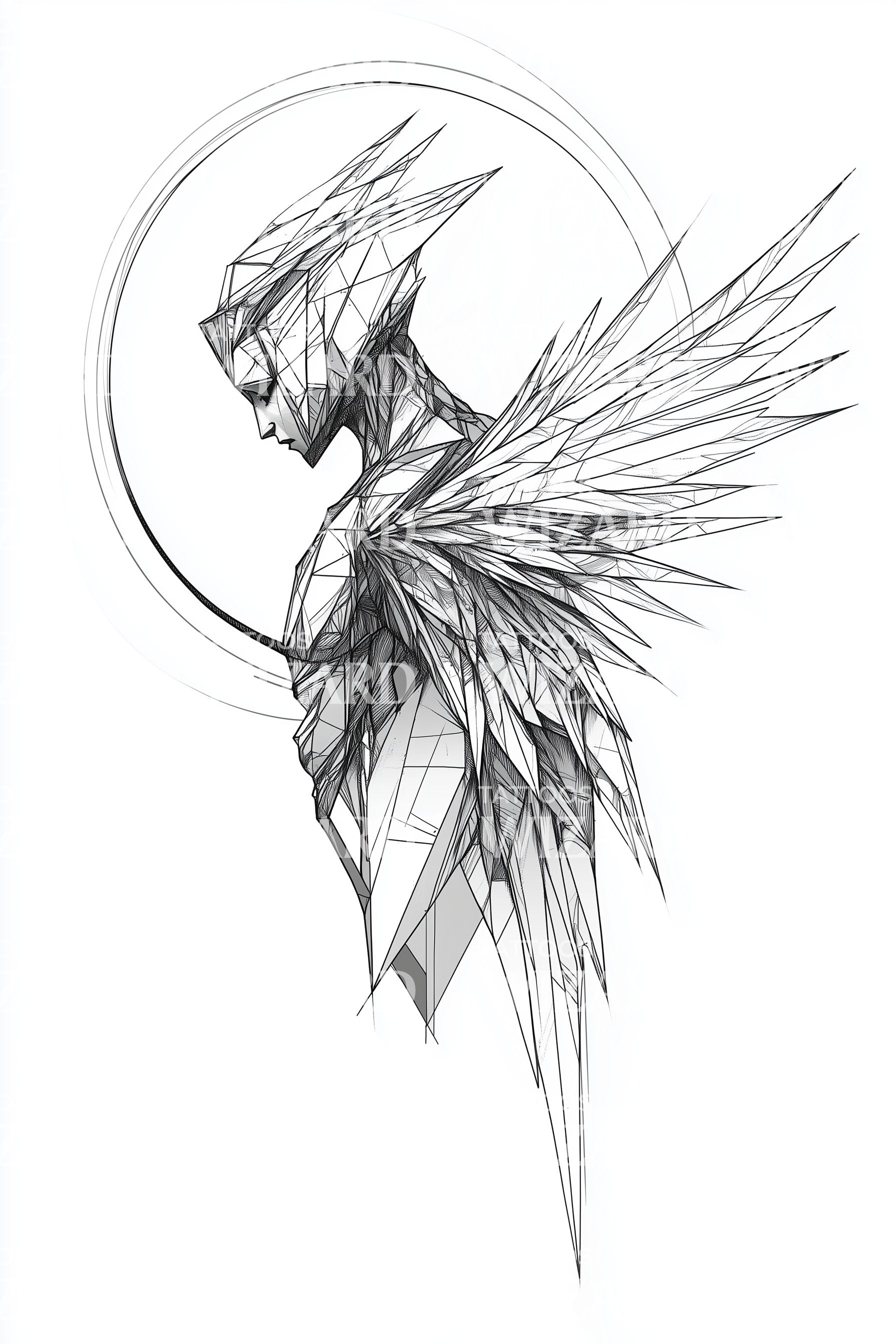 Shard-lined angel bows within a clean halo, formed from intersecting triangles and delicate graphite threads. Geometry splinters like stained glass, suggesting broken past transformed into luminous clarity. Wings taper into crystalline flight, promising resilience and grace. Worn on skin, it feels protective, contemplative, fiercely personal ascension and renewal.