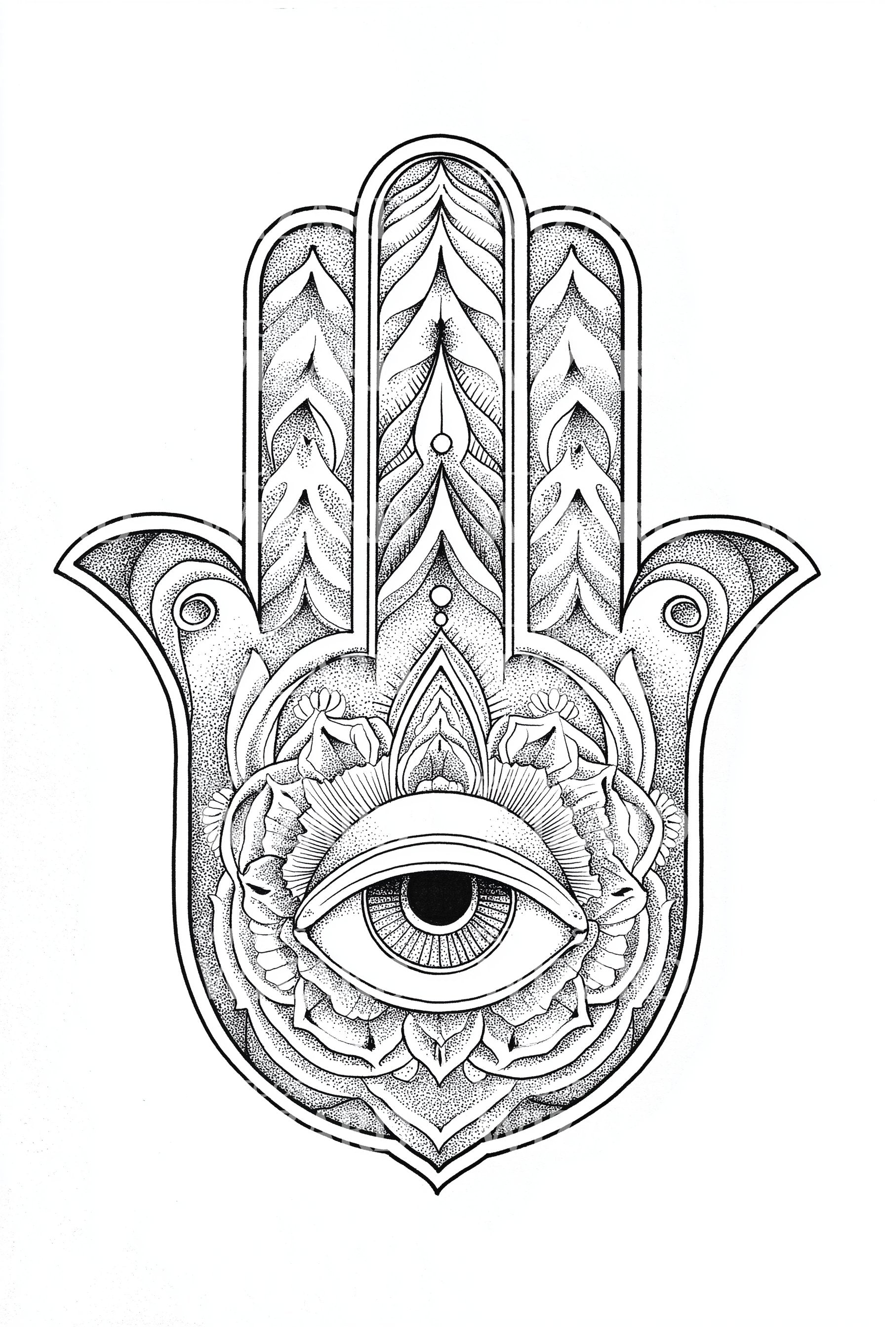 Ornamental hamsa blooms in dotwork petals and mandala filigree, centered by vigilant eye framed by roses. Symbol of blessing and luck, the open hand guards, the eye awakens intuition. Wearer feels calm, protected, luminous. Ideal placements: sternum channeling symmetry; forearm guiding gaze; upper back protective seal; calf flowing.
