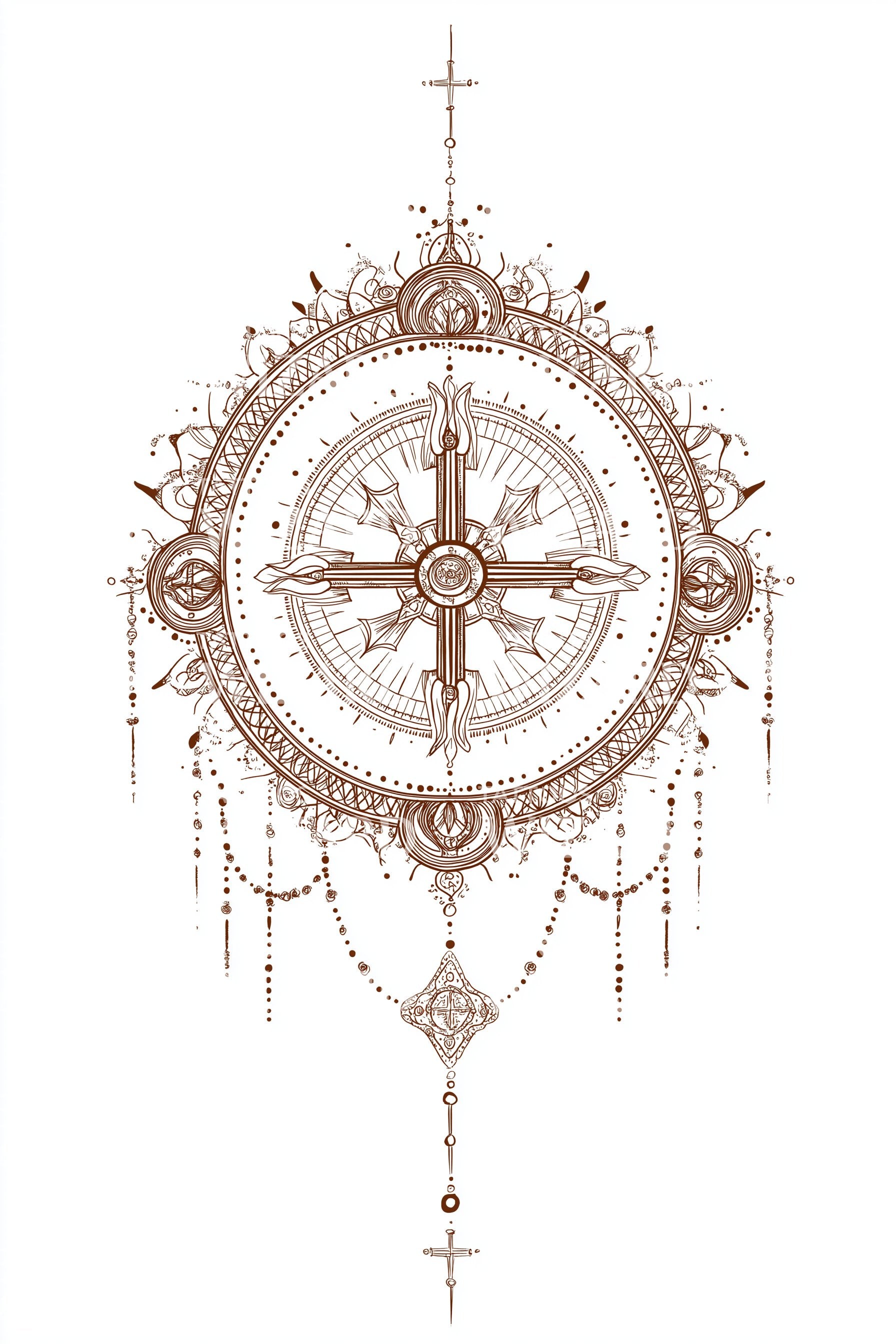 Αυτό το κομψό τατουάζ σε ροζ χρυσό παρουσιάζει μια περίτεχνη πυξίδα, που συμβολίζει την κατεύθυνση και την πίστη. Τα λεπτεπίλεπτα, σταγόνα-σχήματος στολίδια της ενισχύουν περαιτέρω την διακοσμητική της γοητεία, δημιουργώντας ένα πραγματικά μοναδικό και εντυπωσιακό σχέδιο. Δεν είναι απλώς ένα τατουάζ, είναι ένα έργο τέχνης που ακτινοβολεί εκλεπτυσμένη κομψότητα.