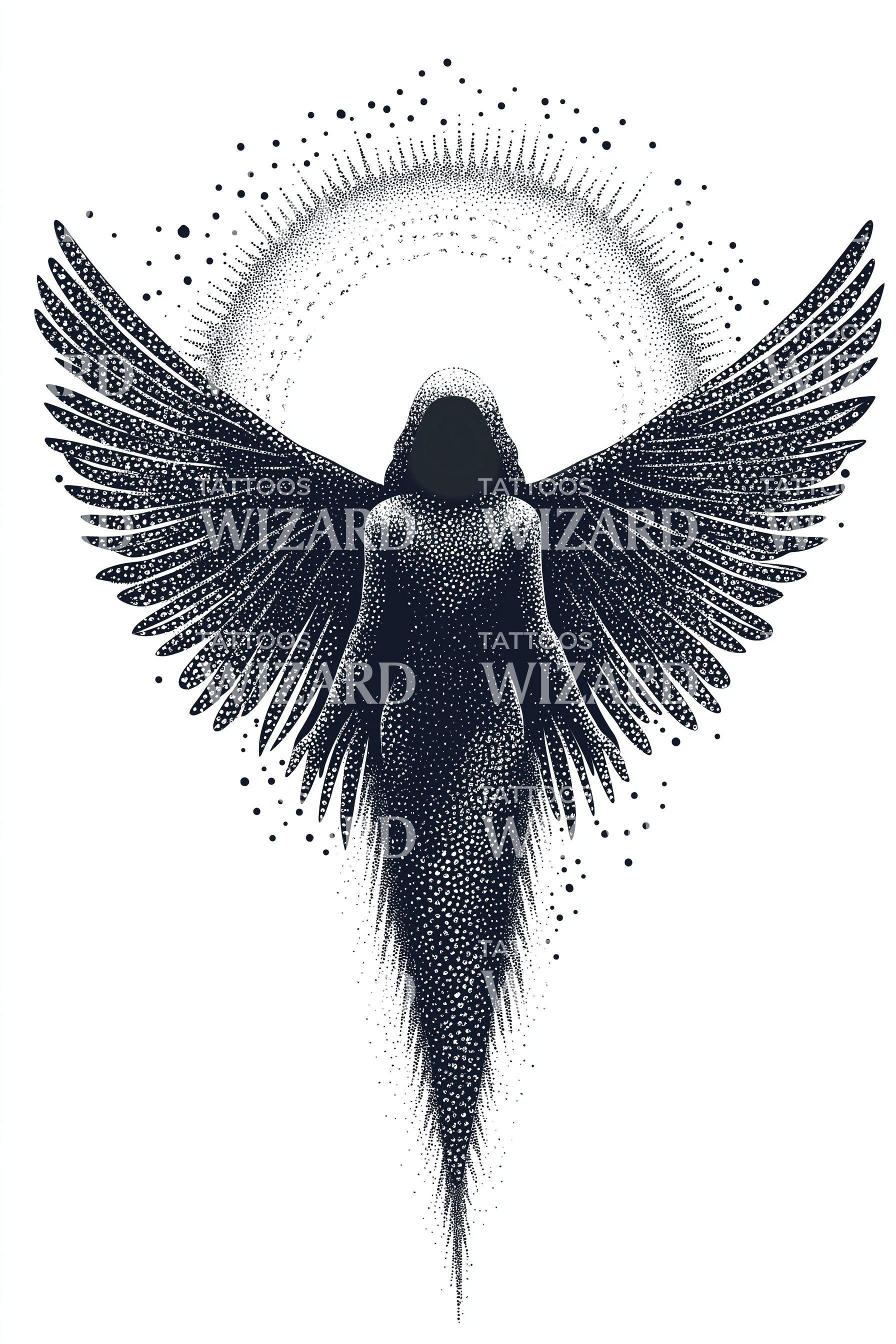 Ethereal dotwork forms a serene, shadowed angel with sweeping wings and a radiant halo, stars drifting like breath. Symbol of guardianship and unwavering faith, light meeting shadow with grace. Worn close, it steadies the spirit, softens noise, and invites courage, devotion, and quiet, winged hope everlasting.