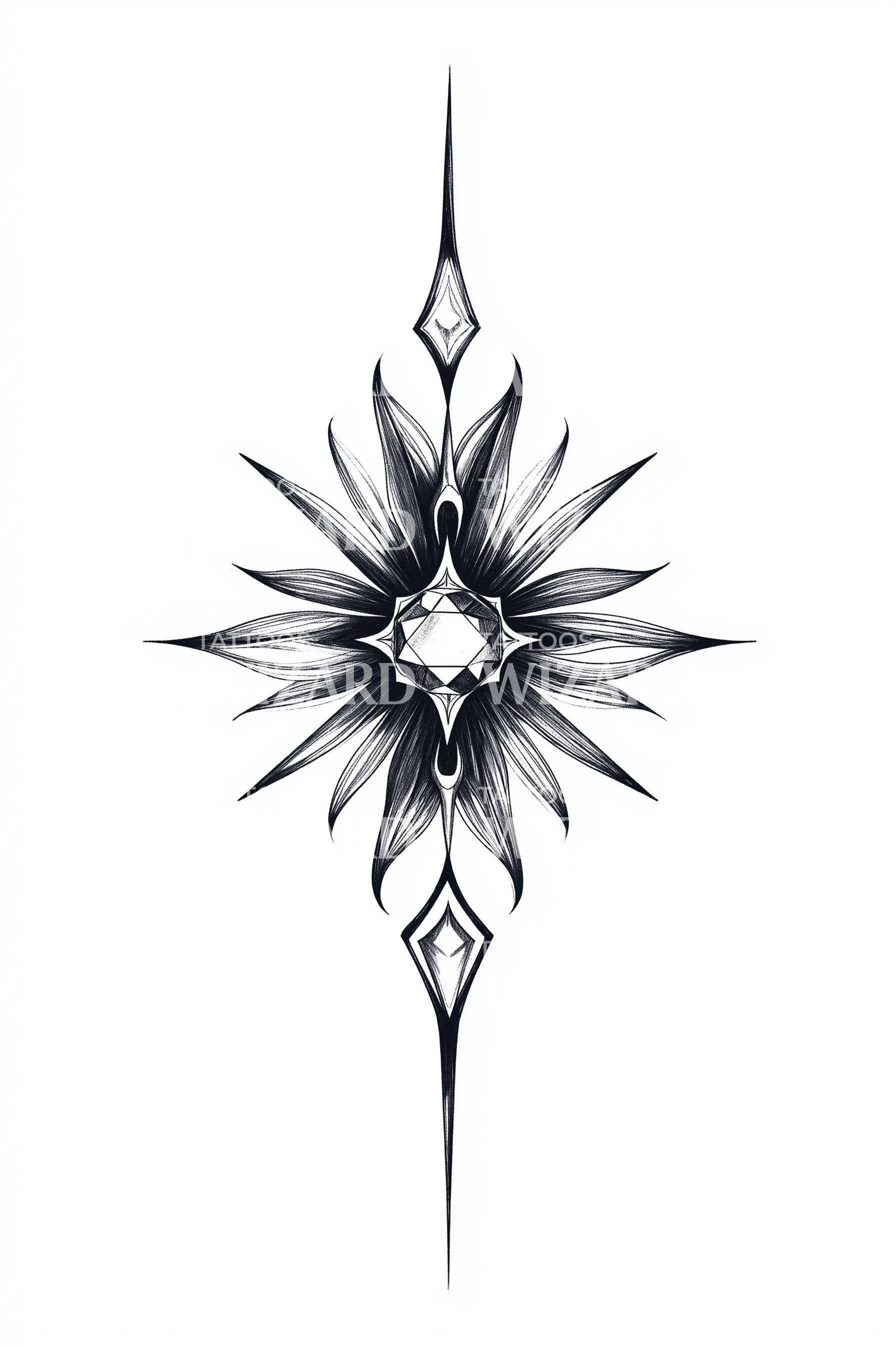 Blackwork sunburst with spiked, petal-like blades radiates from a faceted center gem, framed by diamond sigils and needle-fine tips. Bold contrast and sharp rays evoke clarity, focus, and protection. Worn on skin, it feels like a personal compass, steadying the heart and igniting forward momentum with quiet courage.