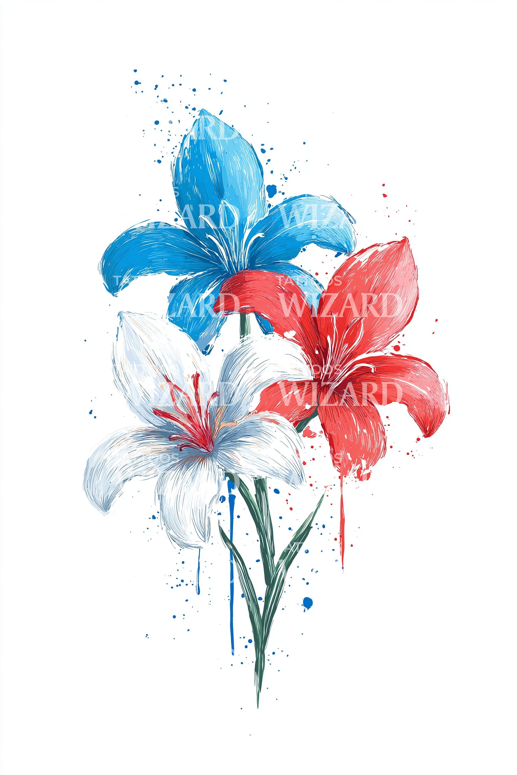 Απελευθερώστε το πατριωτικό σας πνεύμα με αυτό το εξαιρετικό σχέδιο τατουάζ σε υδατογραφία. Με ένα εκπληκτικό μπουκέτο από τρίχρωμα κρίνα, αποτυπώνει τον τέλειο συνδυασμό φύσης και εθνικής υπερηφάνειας. Όμορφα ζωγραφισμένο, αυτό το ανθικό αριστούργημα προσφέρει μια ζωντανή, καλλιτεχνική πινελιά στη συλλογή τατουάζ σας.