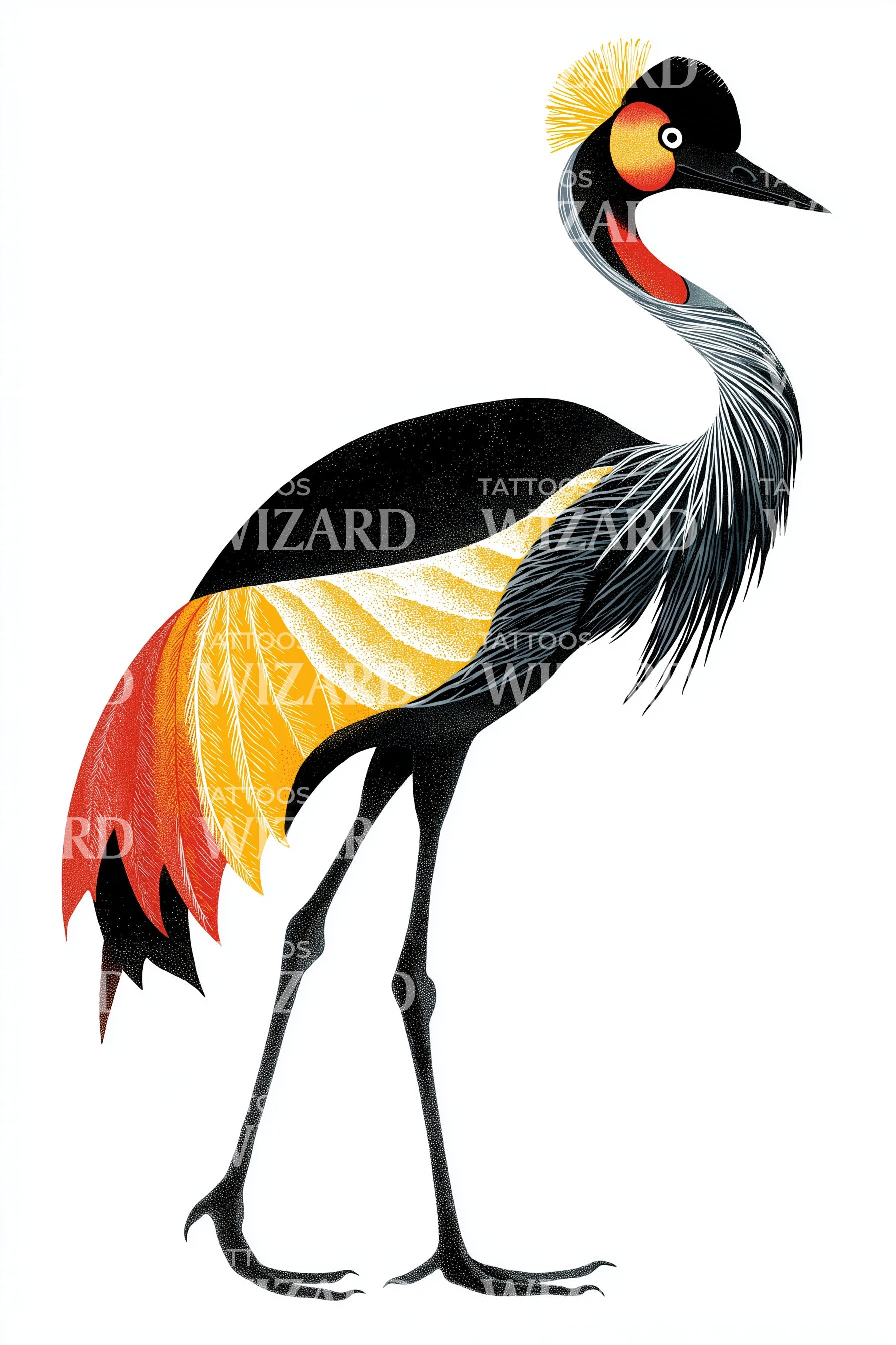 Εικονογραφικό σχέδιο τατουάζ με το εμβληματικό γεράκι με κορυφή της Ουγκάντας, αποτυπωμένο με κομψή γραμμή και απαλές σκιές. Το επιβλητικό πουλί στέκεται μέσα σε ένα κυκλικό έμβλημα εμπνευσμένο από τη σημαία της χώρας, συνδυάζοντας τις τρεις χρωματικές λωρίδες με εκλεπτυσμένη λεπτομέρεια. Ένα περήφανο, χαριτωμένο σύμβολο κληρονομιάς, ισορροπίας και ανθεκτικότητας—ιδανικό για αντιβράχιο, γάμπα ή ώμο.