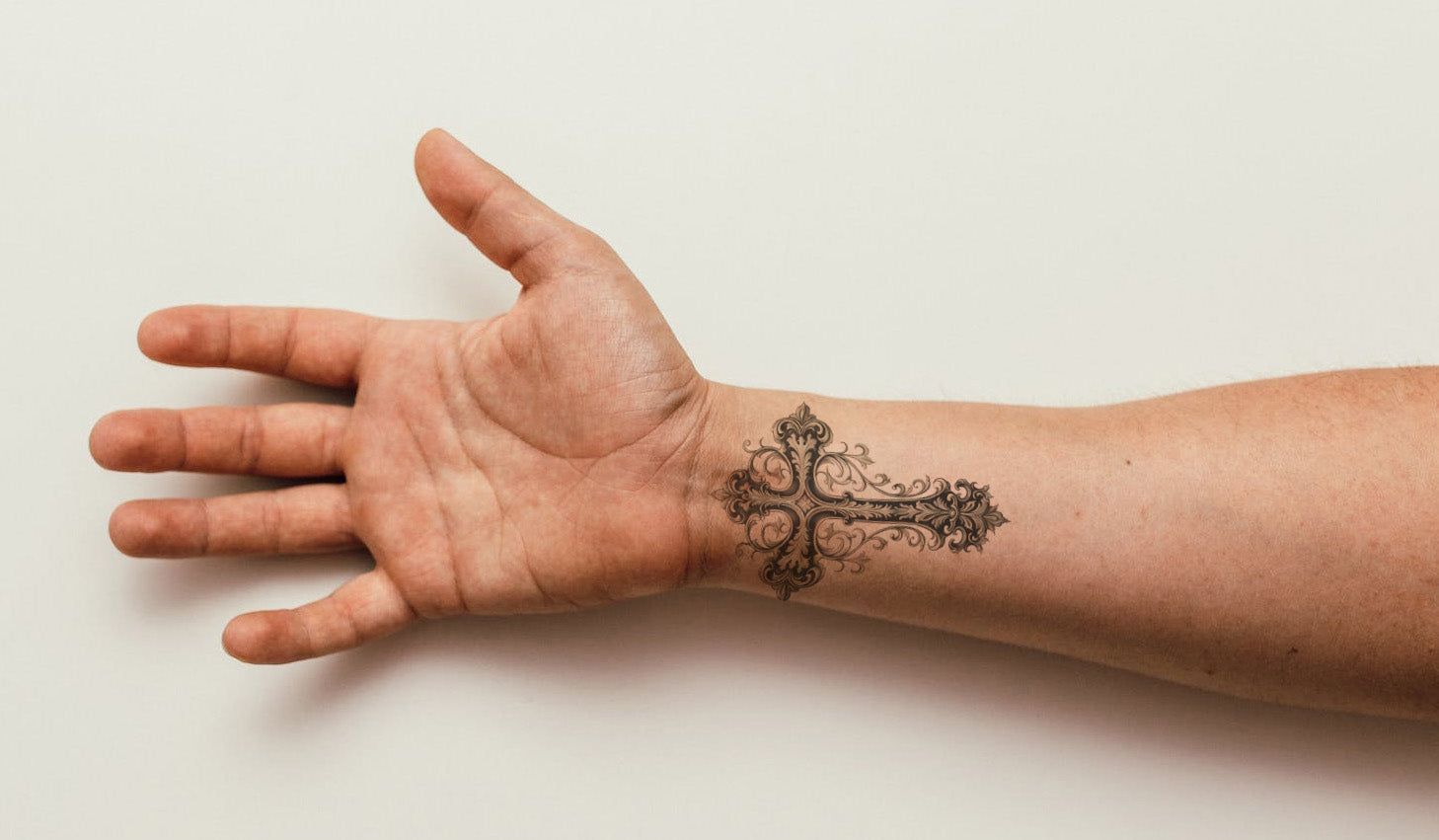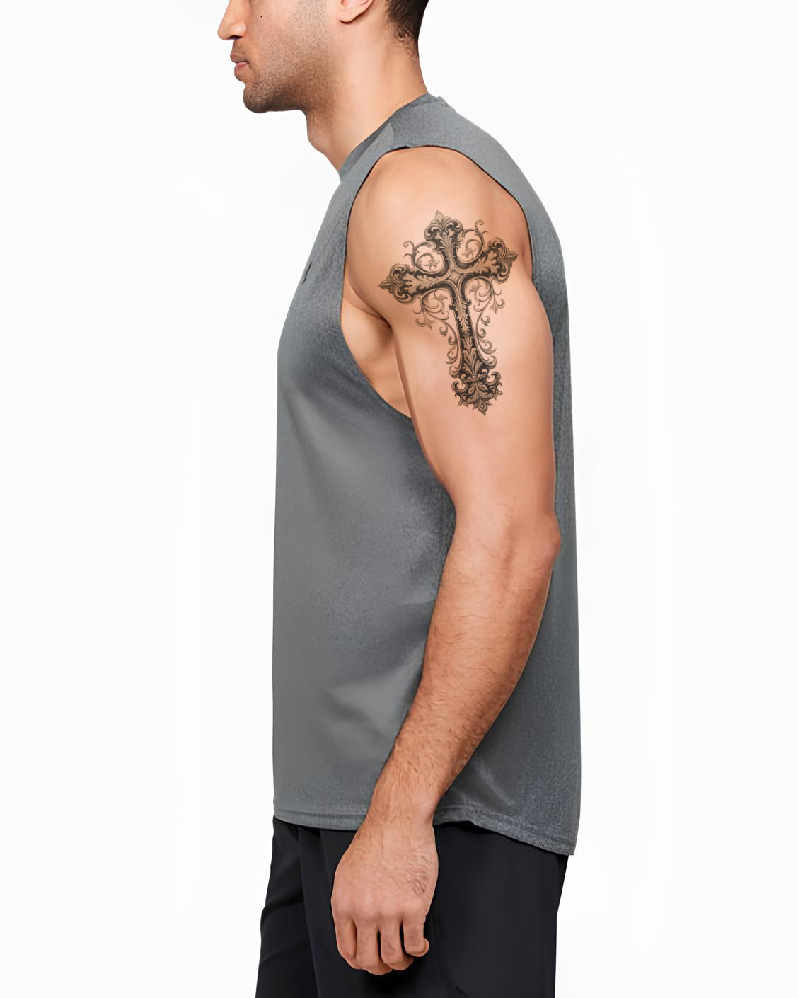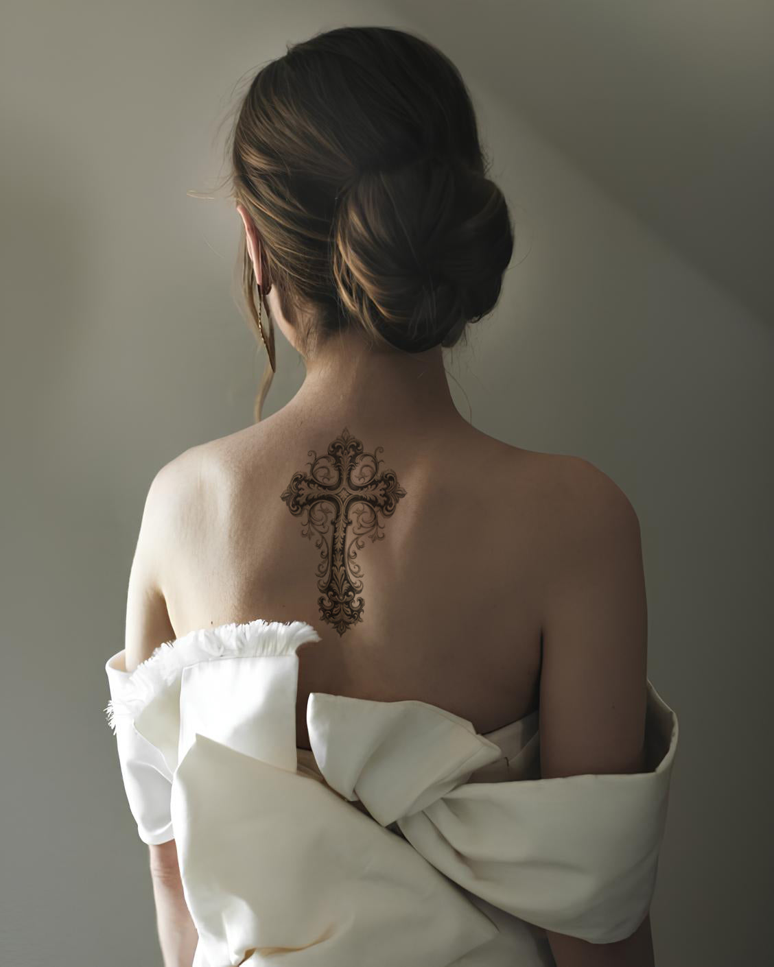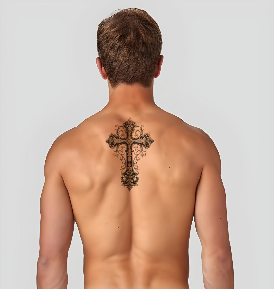 Sumérgete en la belleza divina de nuestro diseño de Tatuaje de Cruz Barroca. Bañado en elegantes tonos negros y grises, teje un motivo exquisito e intrincado de remolinos y adornos. Un símbolo atemporal de fe, transformado en un fascinante emblema religioso para tu piel.