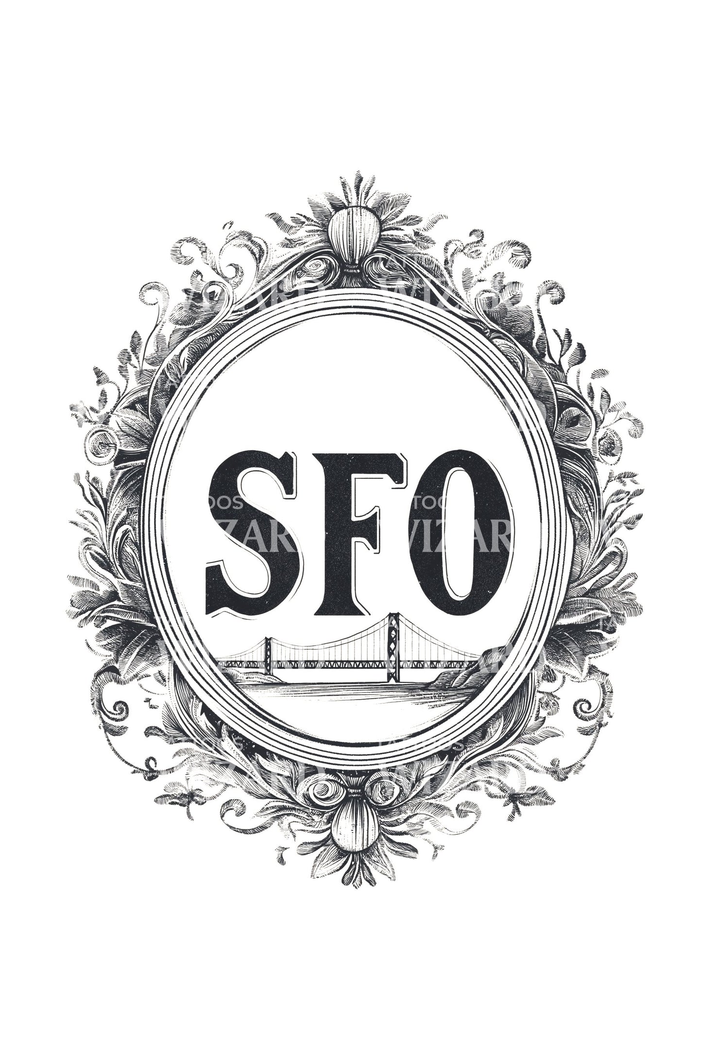 Ornate florals cradle a vintage oval emblem, where bold SFO lettering crowns a finely etched bridge spanning quiet Pacific bay waters. Symbol of crossings and homecomings, it honors San Francisco’s restless coast and steady heart. Wearing it invites briny breeze, city grit, and elegant wanderer pride with grace.