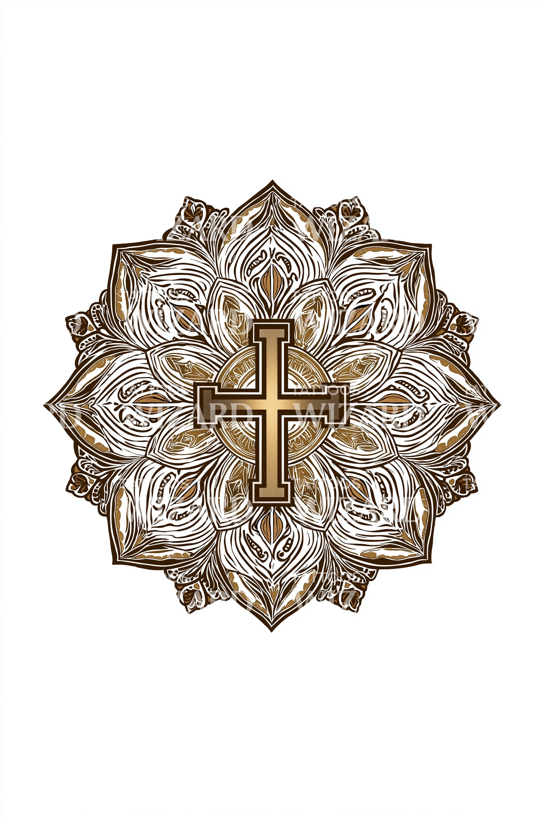 Sumérgete en un toque de lo divino con este diseño de tatuaje ornamental, adornado con detalles barrocos bellamente intrincados. Empapado en el encanto rústico del bronce, está encantado además con destellos de gemas brillantes. Una majestuosa cruz invoca la fe, aportando tanto elegancia como energía espiritual a tu piel.