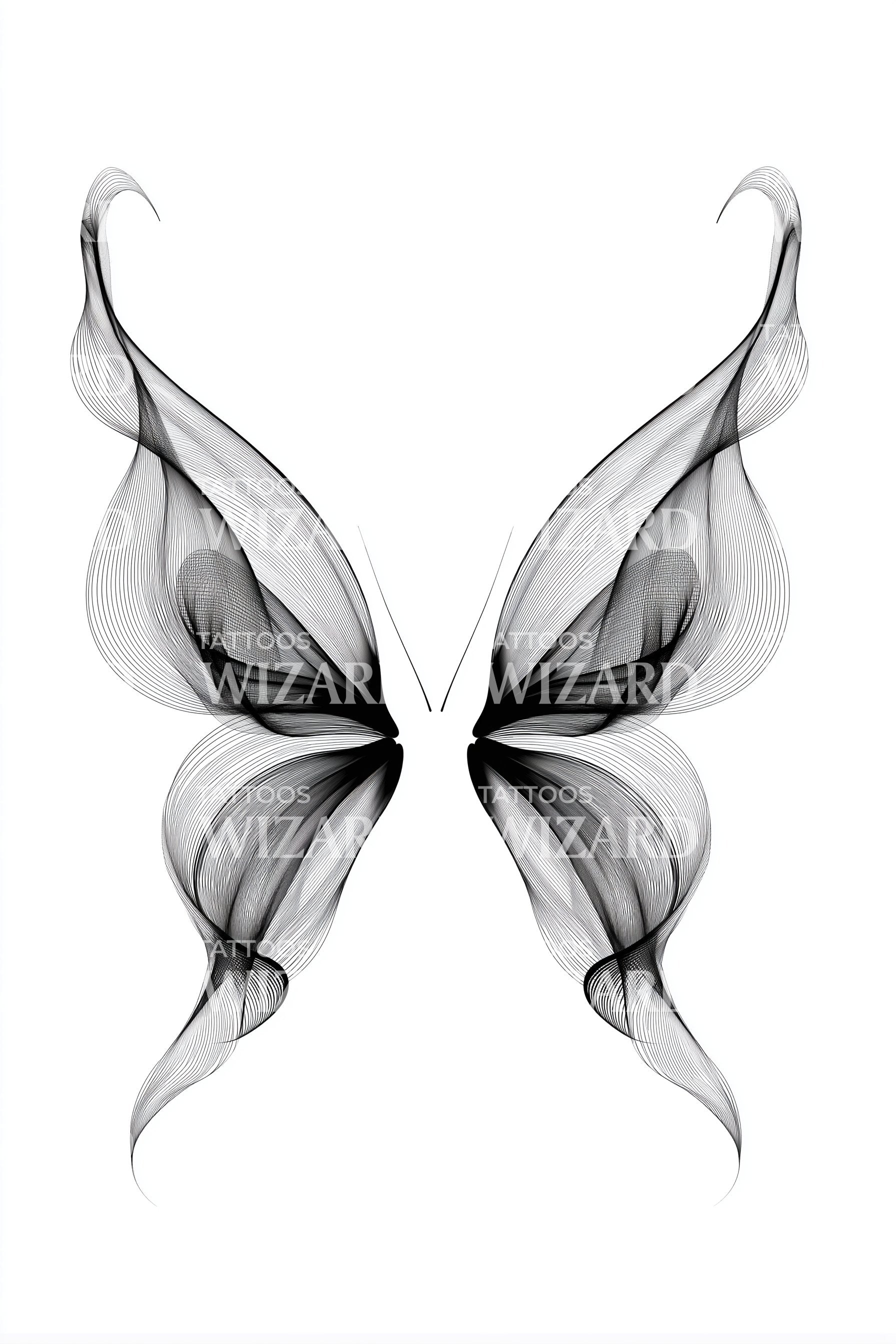 Whisper-soft linework forms an abstract butterfly, wings shaped like drifting smoke, fine ink sketching every curve. Symbol of metamorphosis and breath, it honors fragile beginnings and brave flight. Wearing it feels like carrying grace on the skin, a delicate reminder to rise lightly and move with wonder.