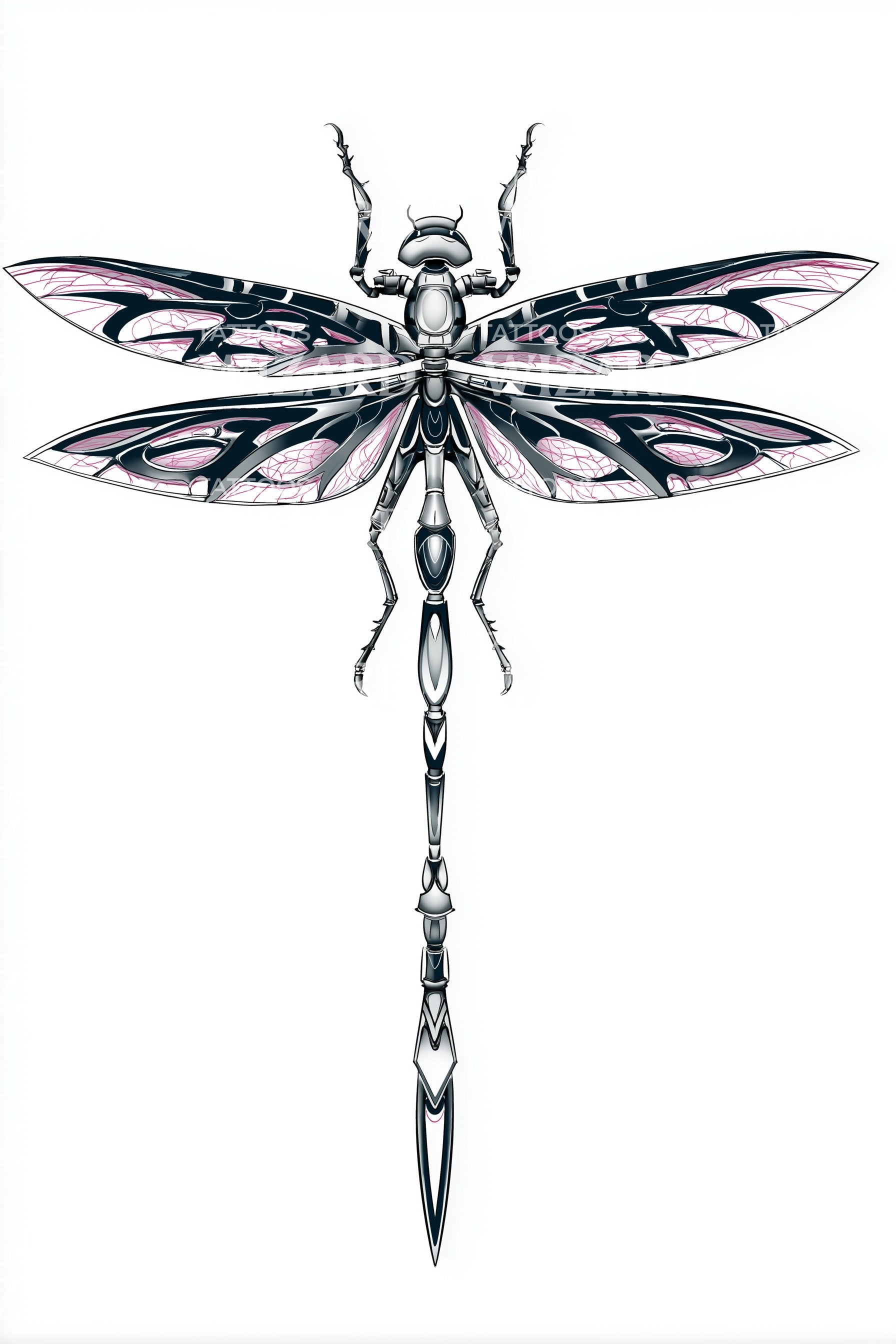 Chromed dragonfly totem spreads techno wings etched with pink circuitry, its segmented body converging into a spear-tail. Geometry meets cyber grace, honoring agility, vigilance, and transformation. A future sigil, it channels focus and forward motion, letting the wearer feel sharp, fearless, and incandescently alive in every decisive step.