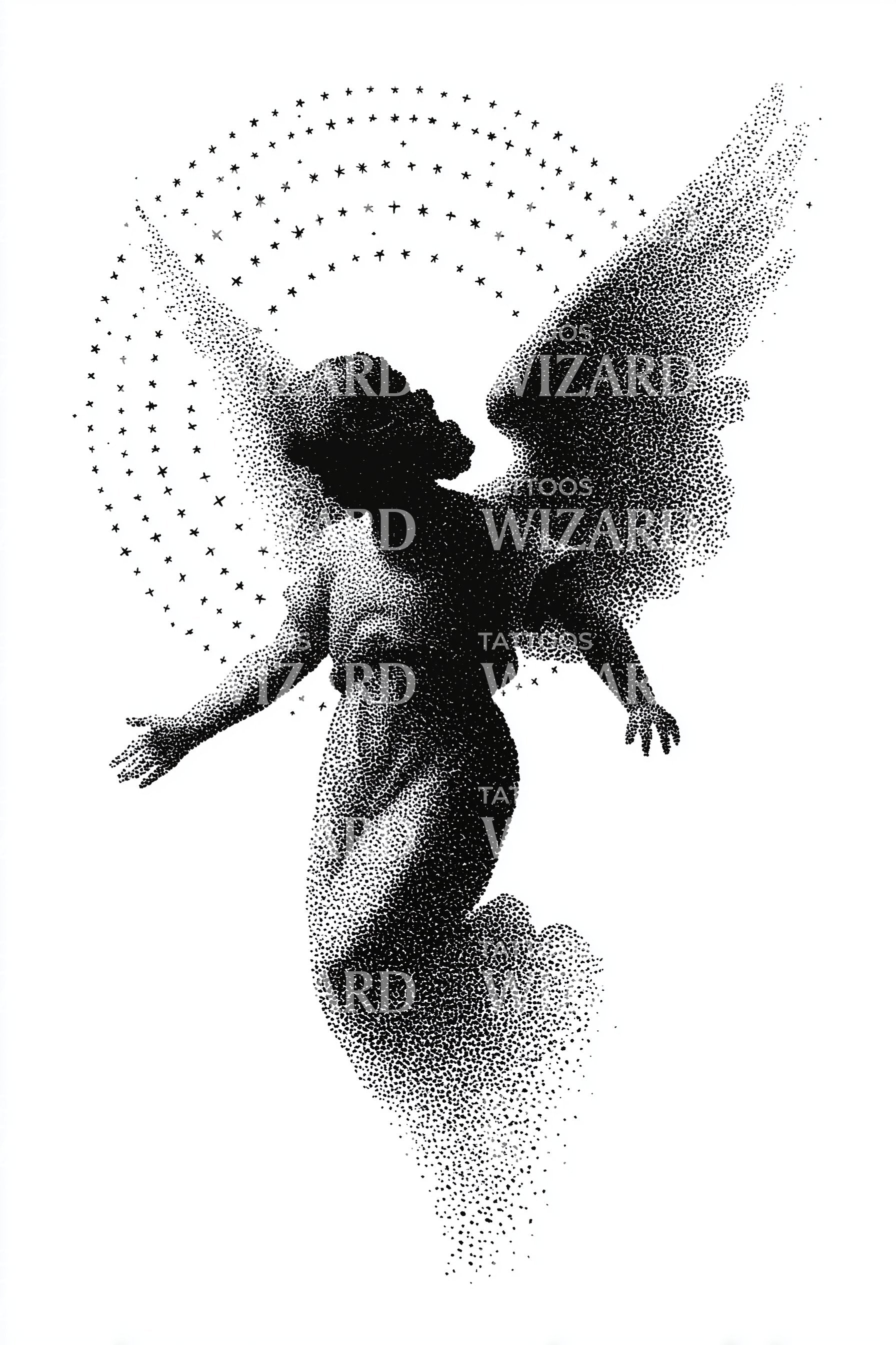 Dotwork angel lifts in a quiet dance, wings dissolving into constellations as concentric star halos arc overhead. Stippled shadows shape flowing robes, suggesting movement and breath. Symbol of grace and spirit, it celebrates joy after weight. Wearing it feels like lightness kept close, a private prayer in motion.