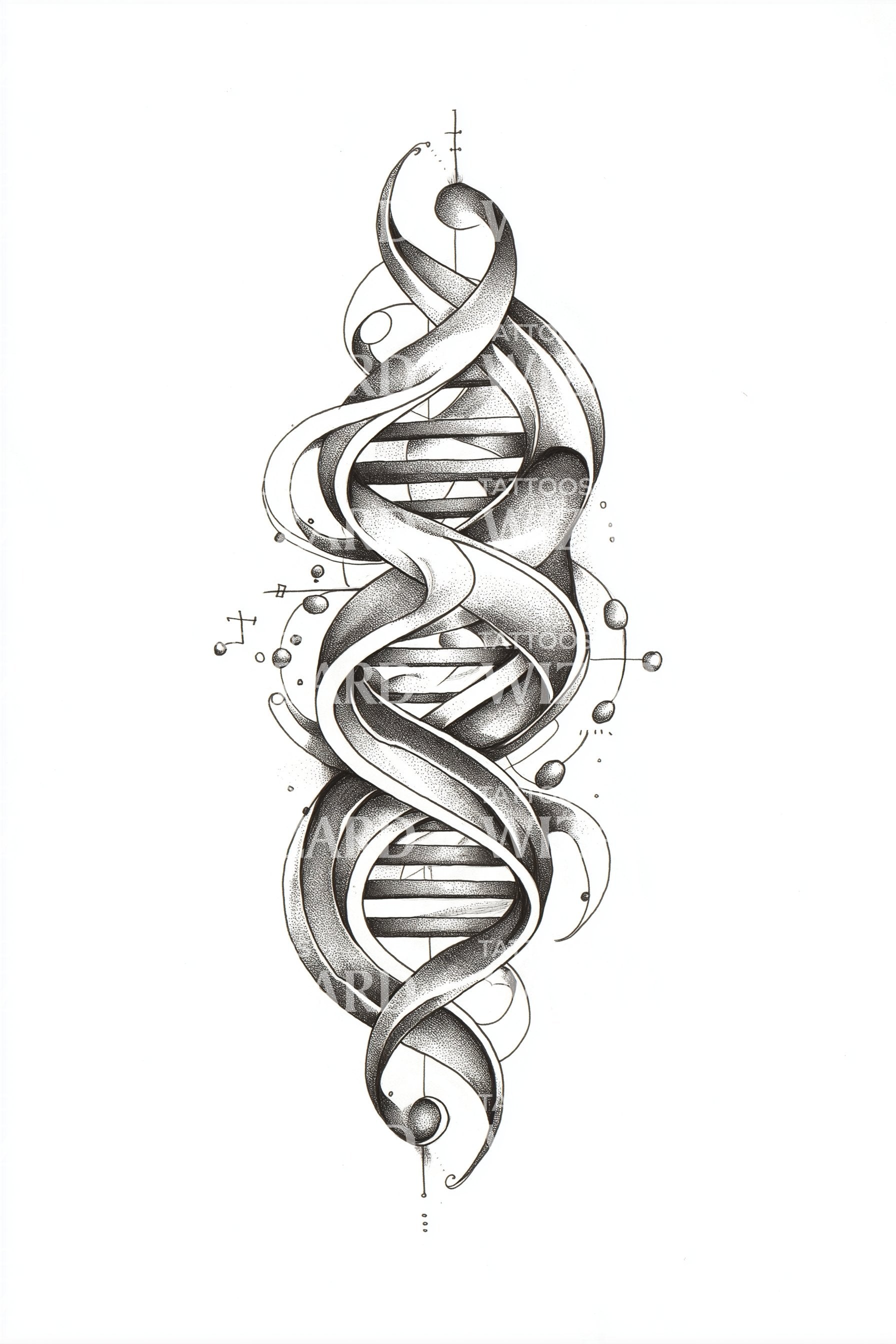 Black and grey dotwork sculpts a ribboned DNA helix, orbiting with minimalist atoms and glyphs. Symbolizing origin, evolution, and self-architecture, it honors science and anatomy while embracing personal growth. Wears like focused calm and curiosity. Ideal on forearm, spine, calf, or sternum, its vertical spiral elongates and centers.
