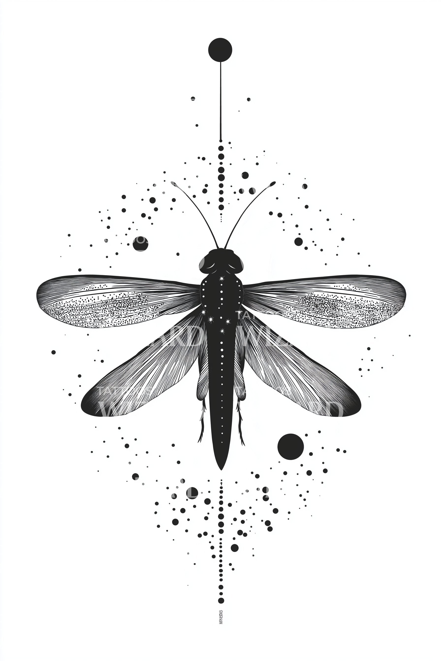 Centred on a clean axis, a monochrome dragonfly unfolds symmetrical wings, etched with fine lines and starry stipple, surrounded by geometric constellations of dots. Symbol of balance, agility, and luminous change, it becomes a quiet compass. Wearing it feels weightless, steady, and awake to graceful transformation.