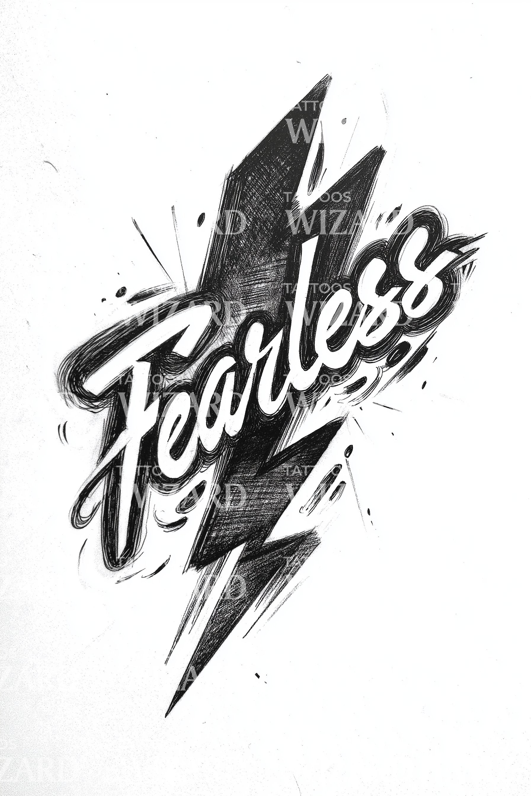 Charcoal-sketched lightning cleaves the page, bold script shouting Fearless as sparks burst around a jagged bolt. Raw shading and quick strokes give live-wire energy. Symbolizing courage in the storm, the bolt channels decisive power. Wearing it feels like catching thunder, carrying momentum, daring every horizon against all doubt.