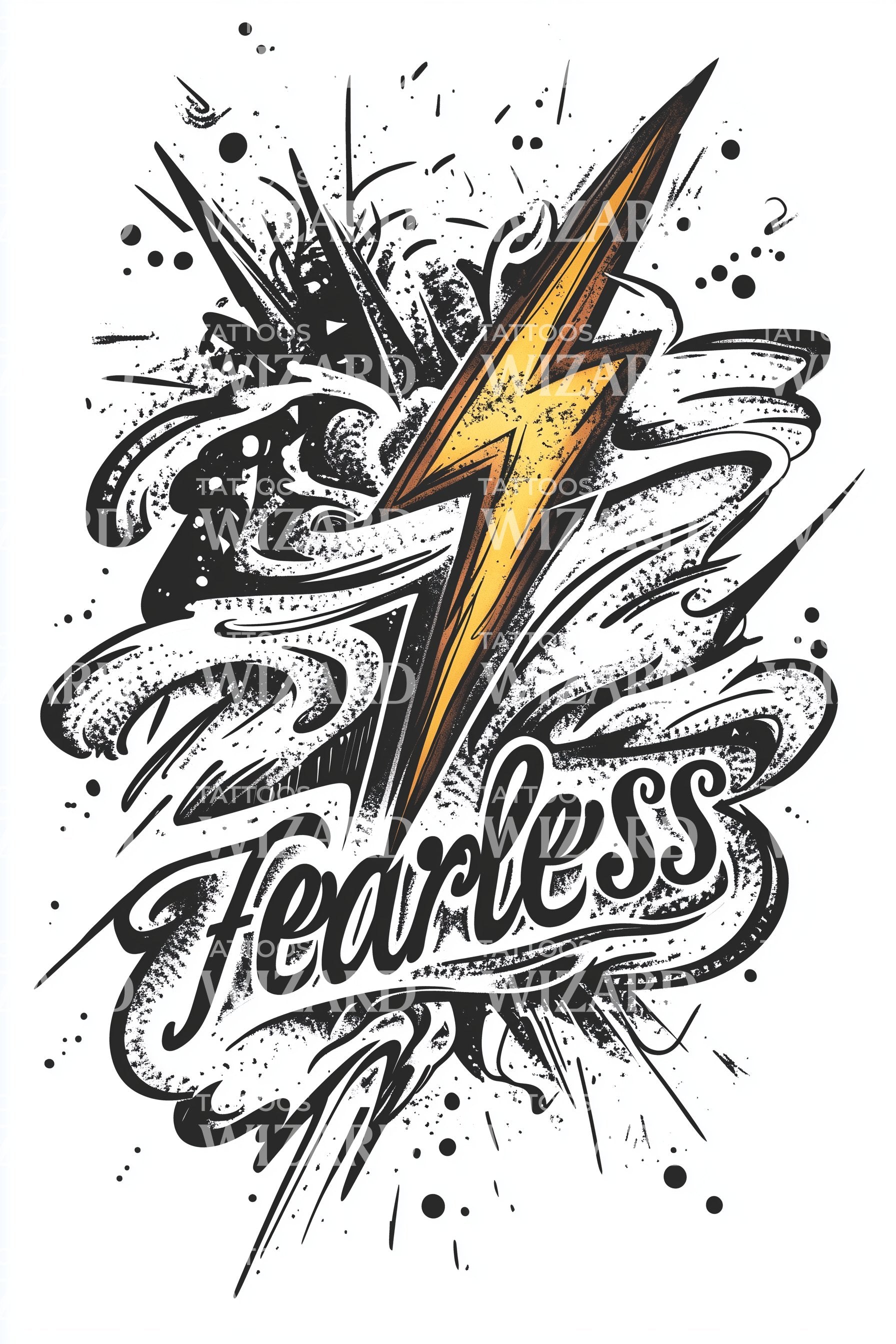 Electric newschool energy crackles in a golden lightning bolt punching through splashy black ink and swirling typography reading fearless. The bolt channels thunder, courage, and raw power, igniting momentum. Wearing it feels like stormlight in your veins, a charged reminder to strike forward without hesitation, every single day.