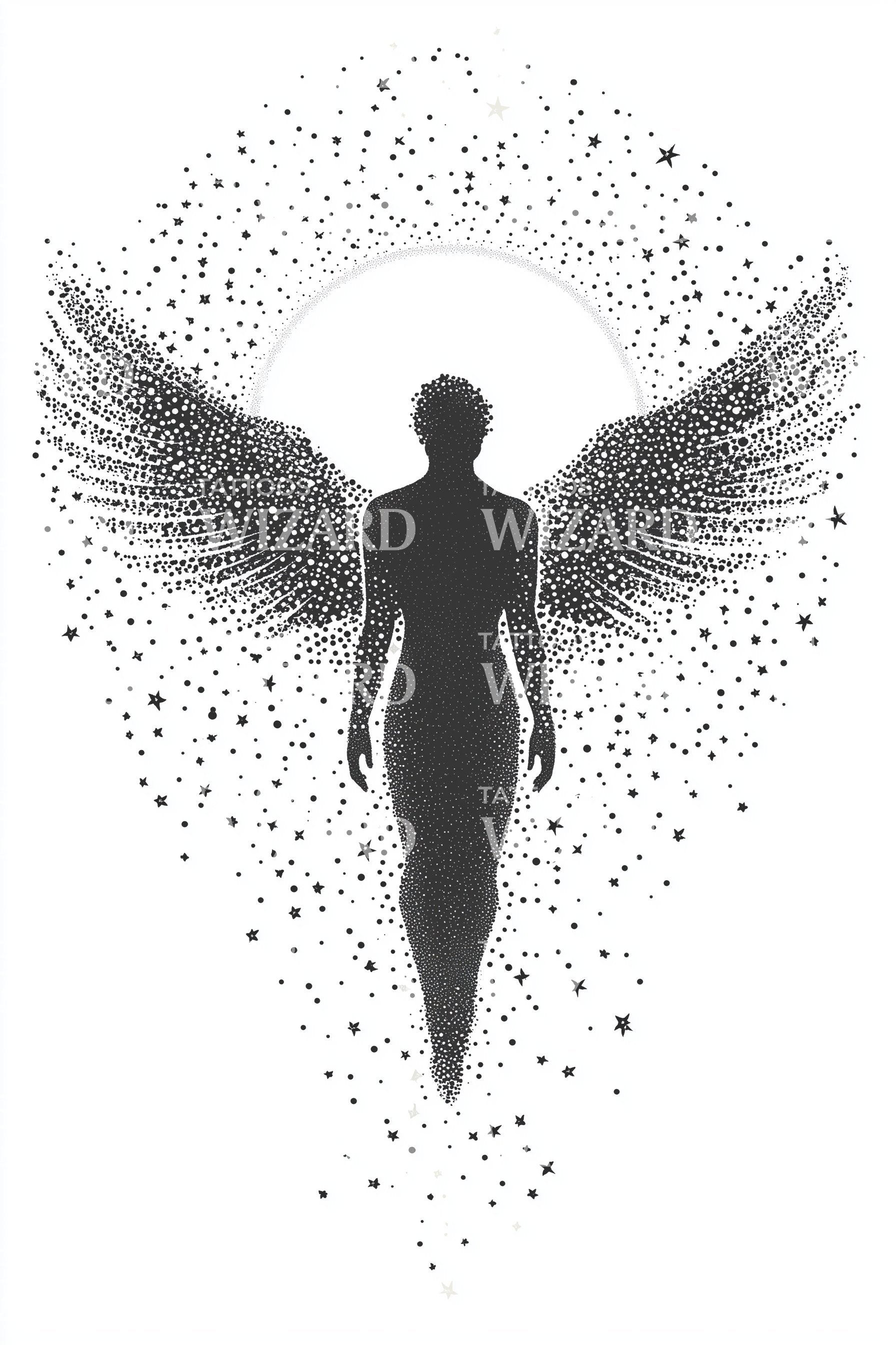 Rising in constellations of dotwork, an angel silhouette ascends through a halo of light, wings unfurling into stardust. Each point marks spirit awakening, guidance, and protection, a quiet hymn to the divine. Worn on skin, this piece feels like uplifted breath, steady resilience, and luminous inner direction.