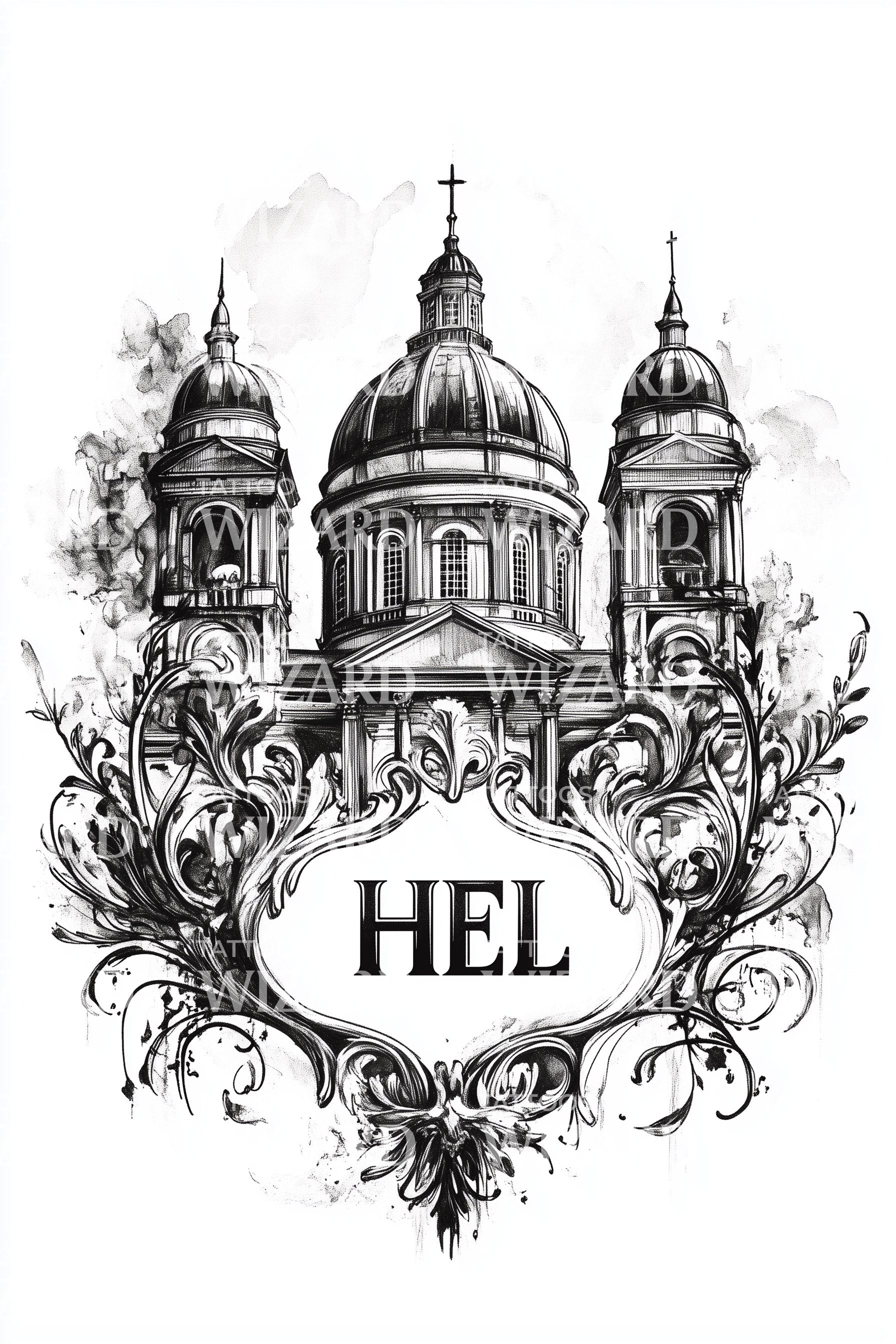 Ink-lined domes rise above an ornate baroque cartouche bearing HEL, framed by flourishing vines and soft watercolor smoke. The cathedral crowns Helsinki’s heart, symbolizing steadfast faith, heritage, and safe harbors. Worn as an emblem, this piece becomes a compass of belonging, serenity, and northern resolve through every journey.