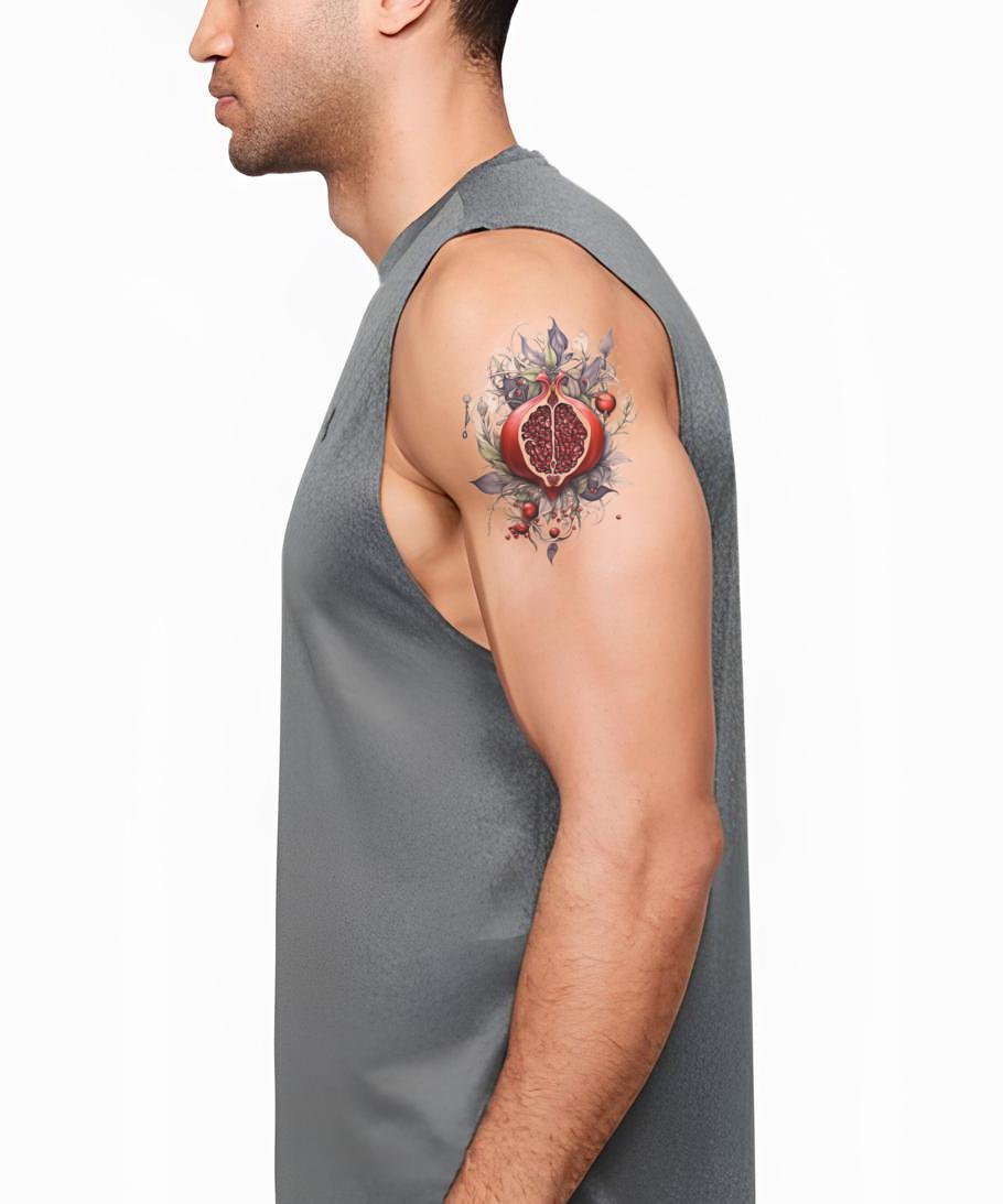 Descubra el exquisito encanto de nuestro diseño de tatuaje botánico ilustrativo de granada. Repleto de ricas semillas rojas encerradas dentro de hojas intrincadamente detalladas, este diseño no solo captura la vibrante vitalidad de la fruta sino que también encarna una obra de arte única. Exprese su amor por la belleza de la naturaleza con esta sorprendente pieza botánica.