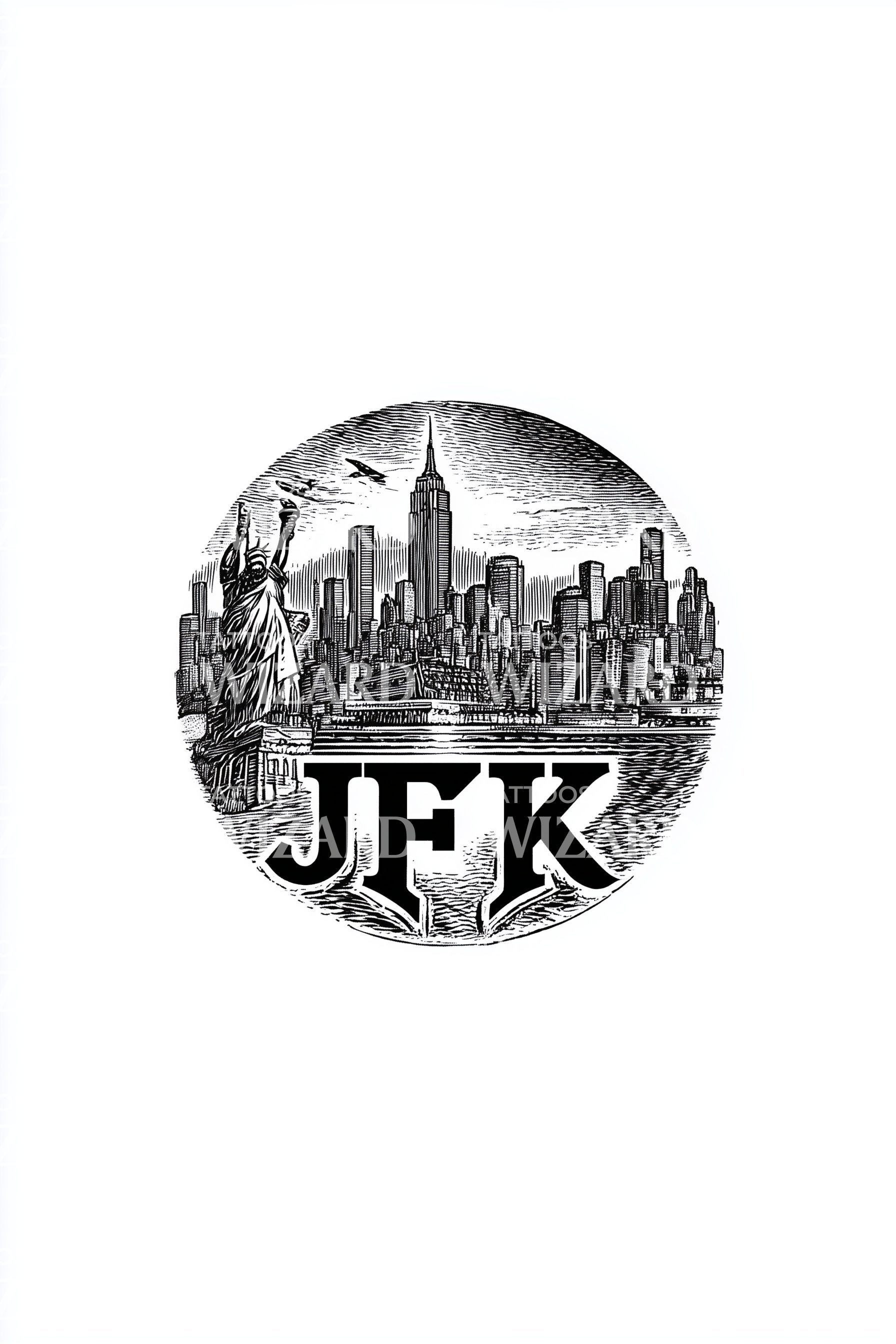 Hand-inked circle frames a vintage sketch of newyork's skyline: Liberty rising, Empire State piercing clouds, a plane departing over bold JFK. Urban lines whisper movement and arrival, a compass for travel hearts. Symbol of beginnings, resilience, and homecoming, this design feels like momentum, courage, and citylight belonging.
