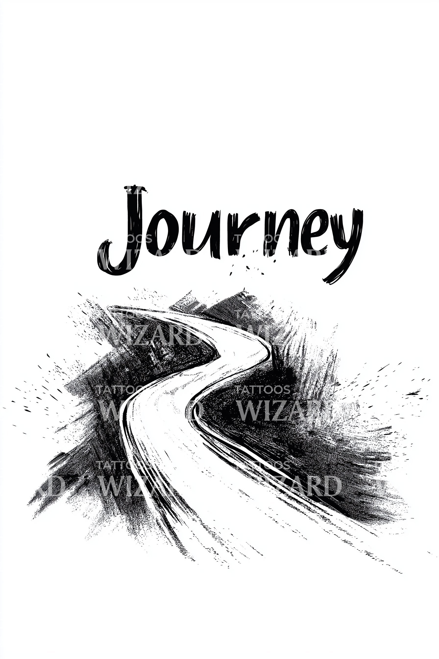 Ink-brushed script reads Journey above a sweeping road, sketched in textured charcoal strokes and splashes. The winding path symbolizes progress and possibility, a personal map for adventure and resolve. Wearing it feels like quiet momentum on skin, a daily motivator to choose the next step with courage.