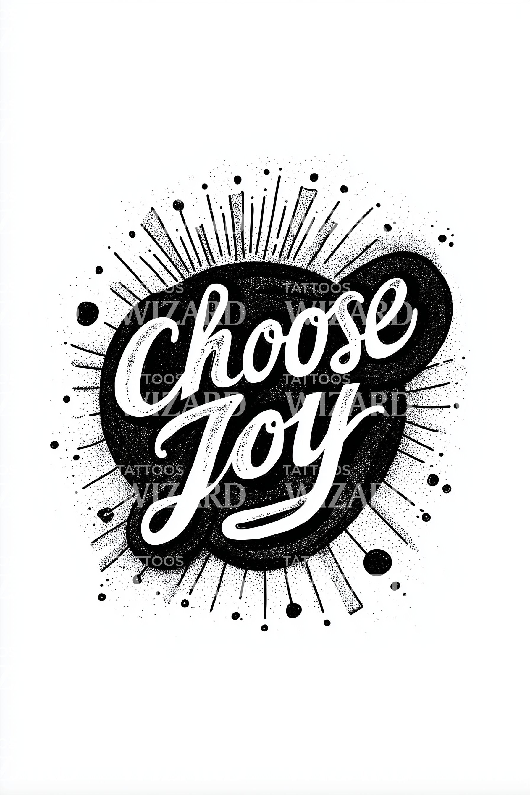 Bold blackwork script forms a retro badge reading “Choose Joy,” ringed by stippled rays and playful ink bursts. Sun-like radiance symbolizes intention and resilience, choosing optimism even in shadow. Wearing it feels buoyant and empowering, a pocket anthem that steadies the heart and sparks daily positivity.