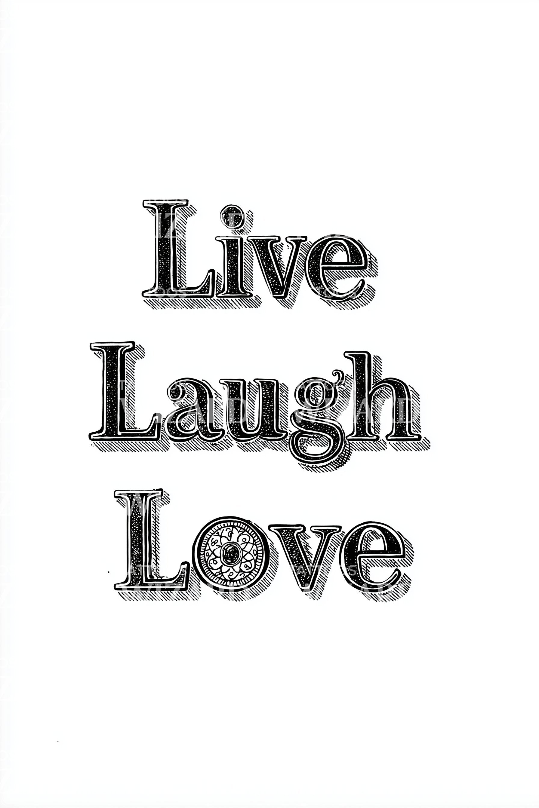 Bold blackwork typography stacks Live, Laugh, Love in engraved-style serif letters, hatched and shadowed for vintage depth. The O blooms into a delicate mandala, a quiet center of joy. Together, the quote becomes a compass, guiding daily presence, playful laughter, and wholehearted affection. Wearer feels grounded, bright, and brave.