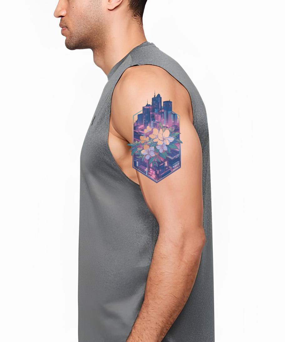 Experimenta la fusión del encanto urbano y la elegancia natural con este diseño de tatuaje geométrico. Presenta un paisaje urbano entrelazado intrincadamente en un loto neón en flor, capturando el contraste entre la vida bulliciosa de la ciudad y la serena belleza floral. Ideal para amantes del arte corporal geométrico y urbano único.