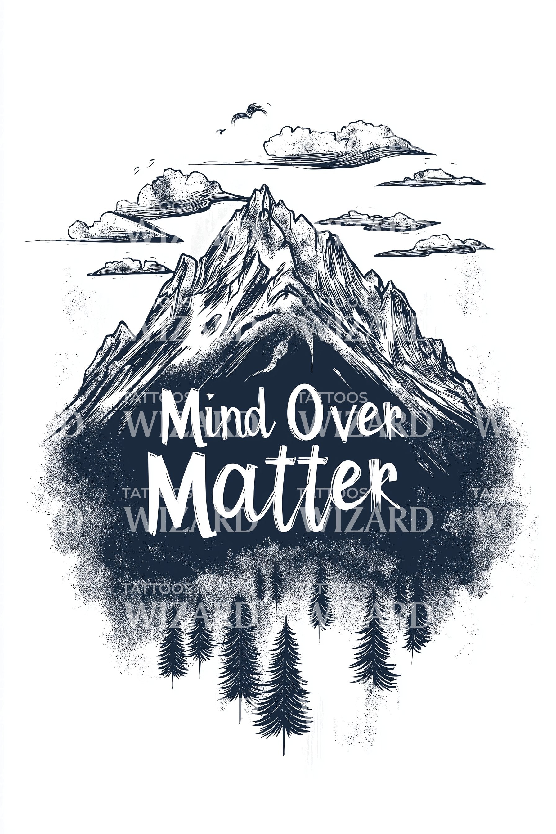Stark black-and-grey peaks rise above a misted forest, stippled clouds and birds framing hand-lettered Mind Over Matter. The summit embodies ambition; the pines, resilience; the sky, possibility. Worn on skin, it steadies breath, rallies grit, and anchors calm focus for every climb beyond matter, through storms and doubt.