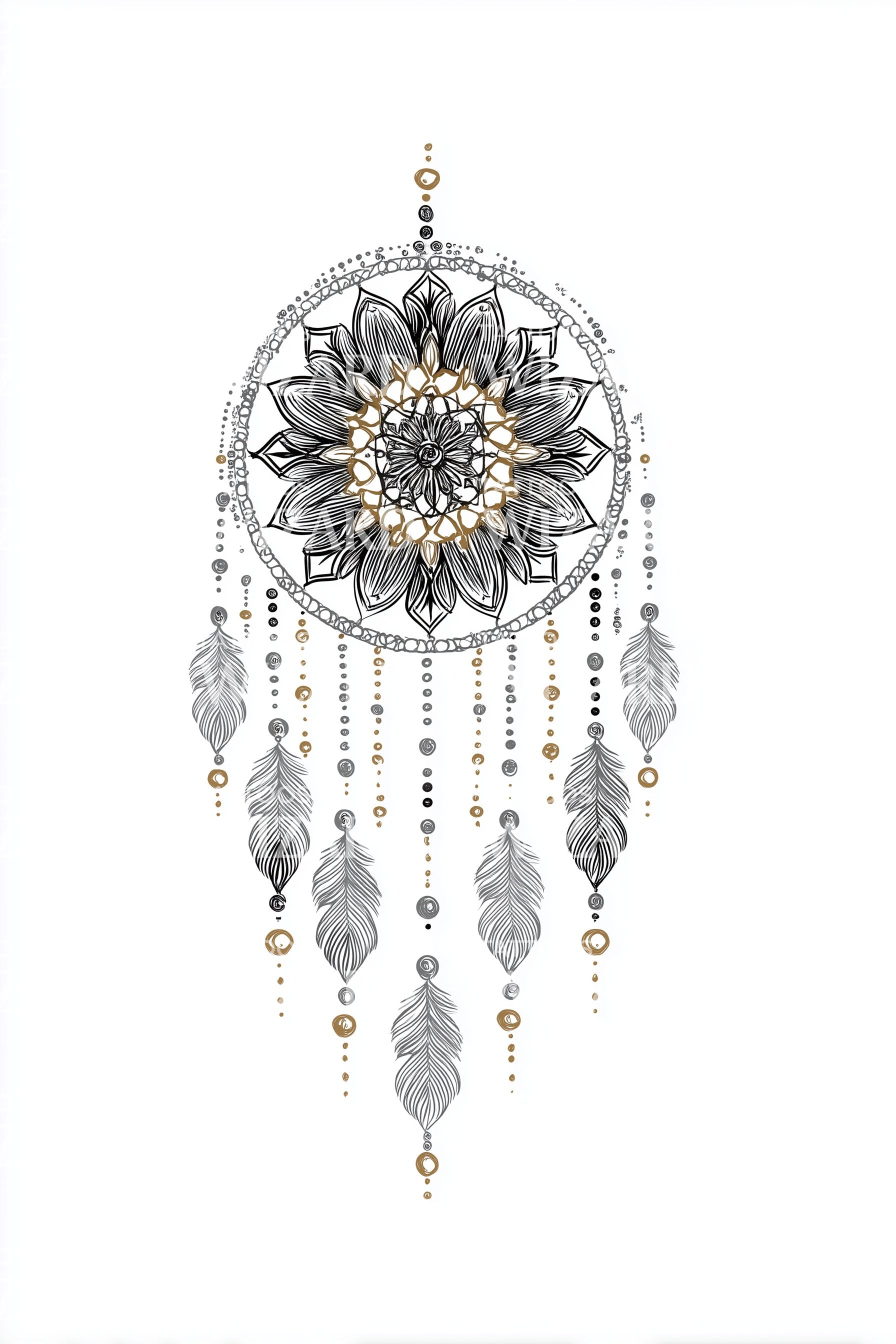 Sumérgete en la elegancia de este diseño de tatuaje de mandala monocromático. Infundido con toques de gris, la complejidad del diseño se realza con un impresionante atrapasueños y delicadas plumas. Este elegante tatuaje captura la belleza mística de los mandalas, convirtiéndolo en una elección perfecta para cualquier entusiasta del tatuaje.