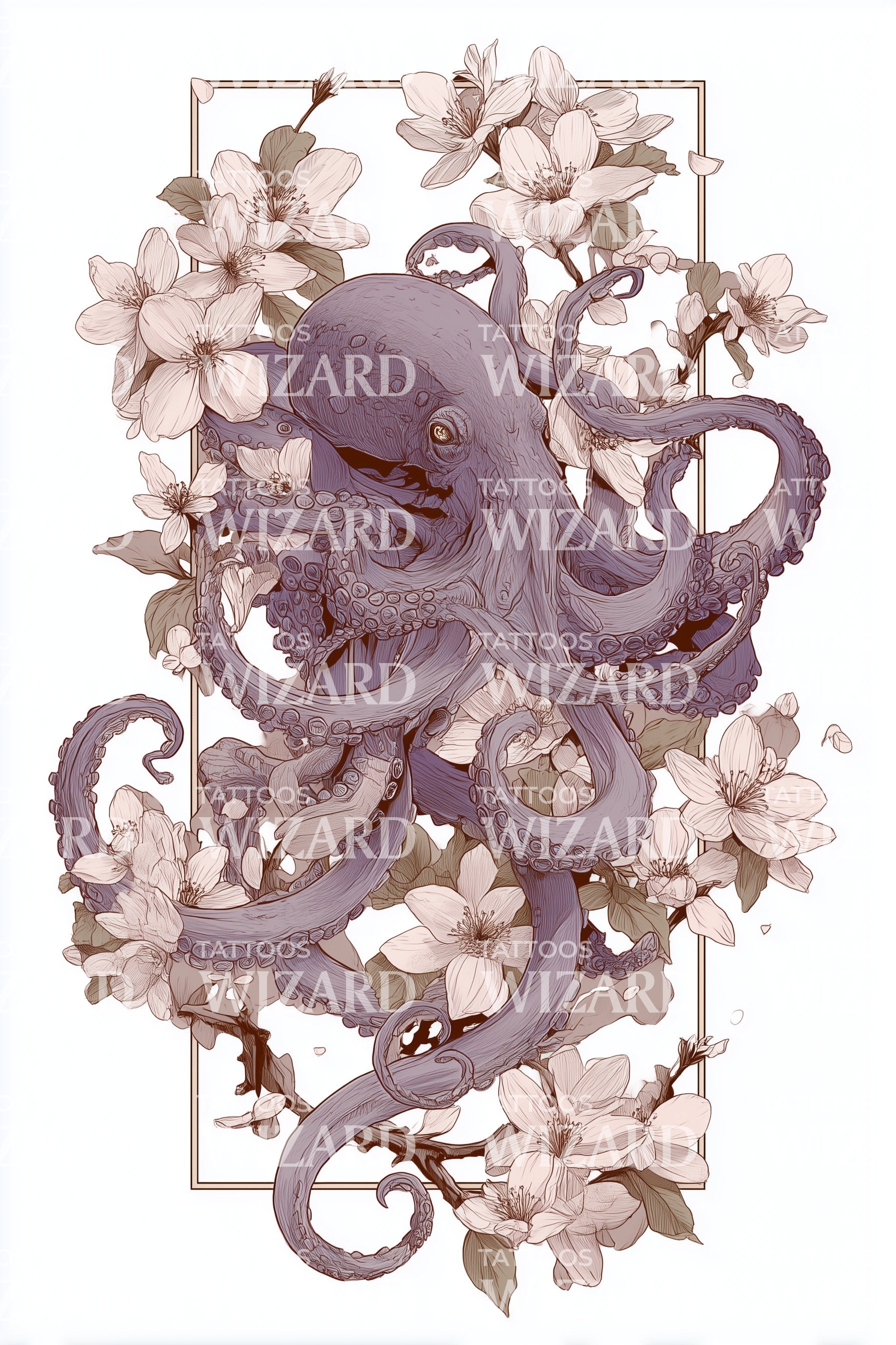 Sumérgete en la mágica fusión del mar y la flor con nuestro diseño ilustrativo de tatuaje. Destaca un espléndido pulpo púrpura, cuyos tentáculos se entrelazan intrincadamente con hermosas orquídeas. Esta mezcla de fantasía oceánica y gracia floral seguro te hará destacar. Haz de tu piel un lienzo para esta obra maestra marina y floral.