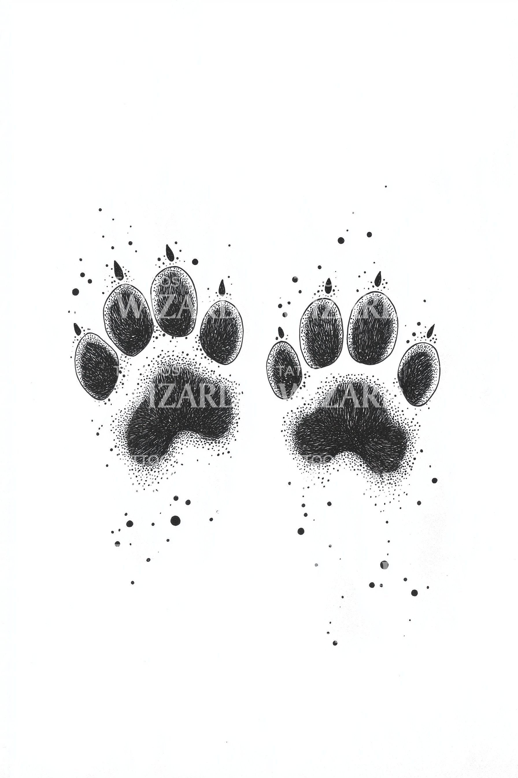 Black & grey dotwork paw prints bloom with speckled texture, grain, soft halos and inky splashes, like fresh steps on paper. Each pad echoes loyalty, play, and a beloved pet’s enduring path, a tender memorial. Wearing it feels grounding, heartwarming, as if tiny paws still walk beside you.